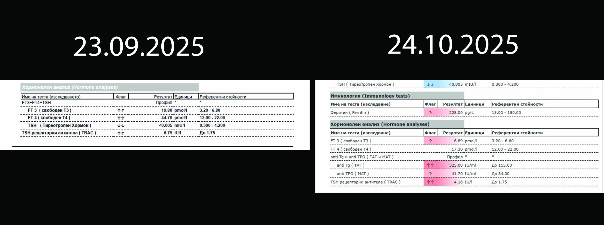Здравейте! Извинявам се, че така се включвам в темата, но днес установихме, че имам Базедова болест, причината за установяването е.. ранна бременност.Миналата година бях бременна с дъщеря си, родих на 22.11, изследванията ми бяха перфектни, малко отложих изследванията след раждането покрай бебето, но новата бременност ме накара да пусна отново хормоните и за кое съжаленв тсх тотално се е сринало, а фт3 и фт4 са над горната граница, макар и не много. трак излезе 11, назначиха ми пропицил 2х1, но исках да попитам дали има дами карали бременност и родили здрави бебчета? Много се шокирах днес като видях резултатите, и се притесних за бебето, явно съм я отключила след първото раждане. Ще се радвам да споделите как протече бременността при вас. Благодаря. Предварително!