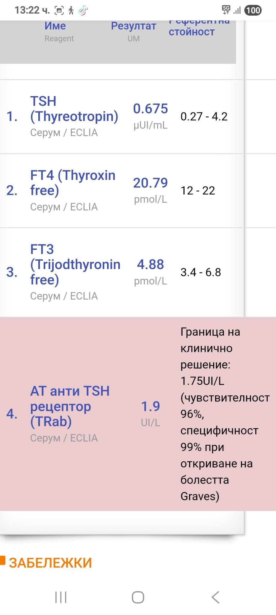 FT4 (свободен тироксин)   14.50 pmol/l   12.50 – 21.50   В норма