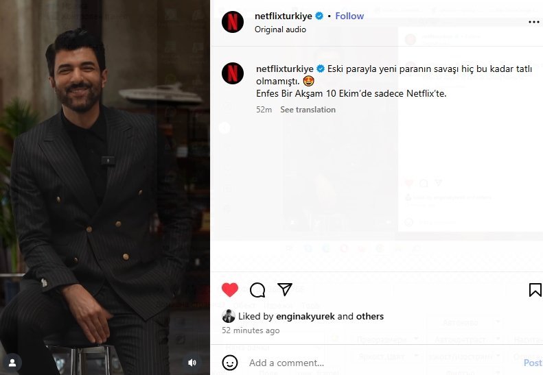 Енгин е лайкнал този пост в инстаграма на Netflix Türkiye.