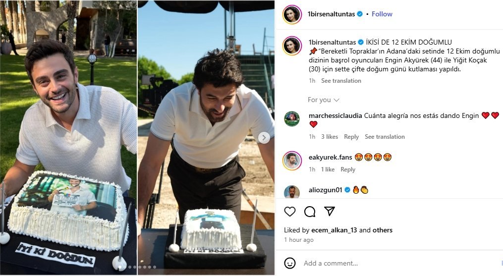 Написа: "На снимачната площадка на "Плодородни земи" в Адана се проведе двойно честване на рождения ден на главните актьори на сериала Енгин Акюрек (44 г.) и Йит Кочак (30 г.), родени на 12 октомври.