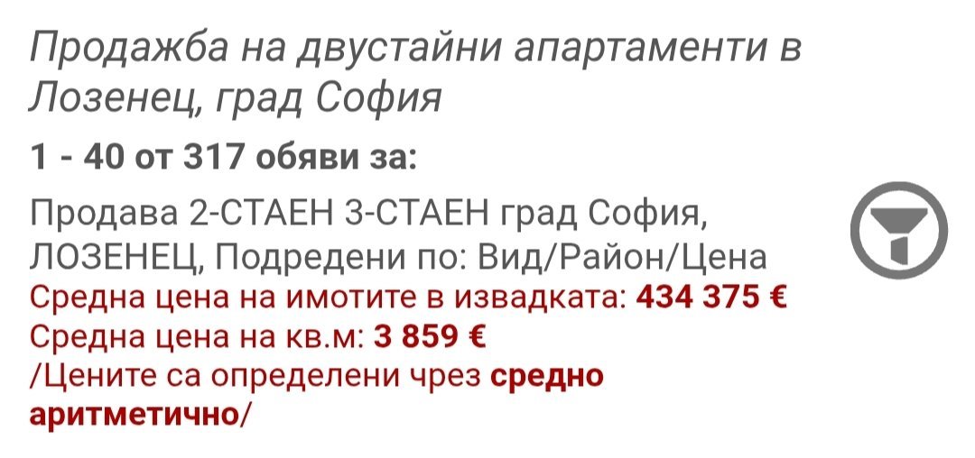 Мили дами и господа, в последните няколко седмици започнахме да търсим имот за майка ми в София, да е по-близо до нас, търсим район Лозенец и близките квартали...в началото мислихме, че нямаме особено шансове да намерим нещо в Лозенец, Хладилника и т.н., което е читаво и около 200-250 К, но се оказа, че пазарът се е променил от последното ми гледане в началото на годината, явно кеша се изхарчи?! В диапазона между 200 - 300 К се оказа, че има не малко имоти, едни нови, други за ремонт, излезли са и тристайни етажи от къщи в този диапазон и тук говорим за Лозенец/в порталите, групи и т.н./. Та се чудя дали да взимаме или да не поизчакаме още малко да намерим перфектния имот. Защото преди 9 месеца, читав имот под 270-280 К нямаше или веднага заминаваше, а сега си седят имоти и дори сме в колебание между няколко, които гледахме. За разлика от преди и продавачите са склонни на коментар и имо избор, виждам едно плато, в което се навлиза...Моля за мнения, простете ако не са изказвам експертно, но това е мнението на реален купувач, който вижда тенденция