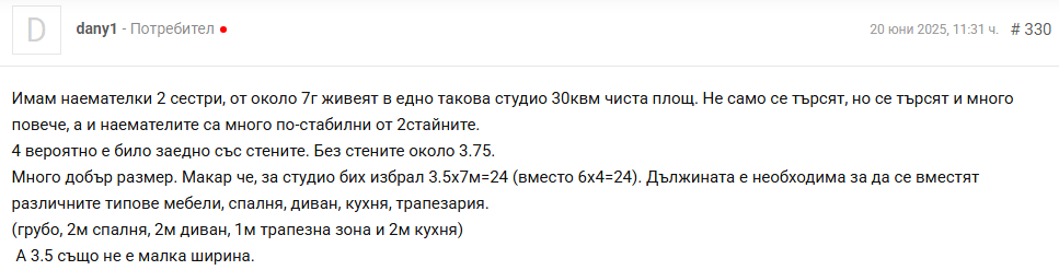 Едностайния, където правих ремонта на терасата беше нает от едно момче за септември без да живее. Вчера ми се обади да ми каже, че се отказва. Пуснах обява във фейсбук. Преди малко го отдадох на семейство новоприходящи молдовци. За 950лв.