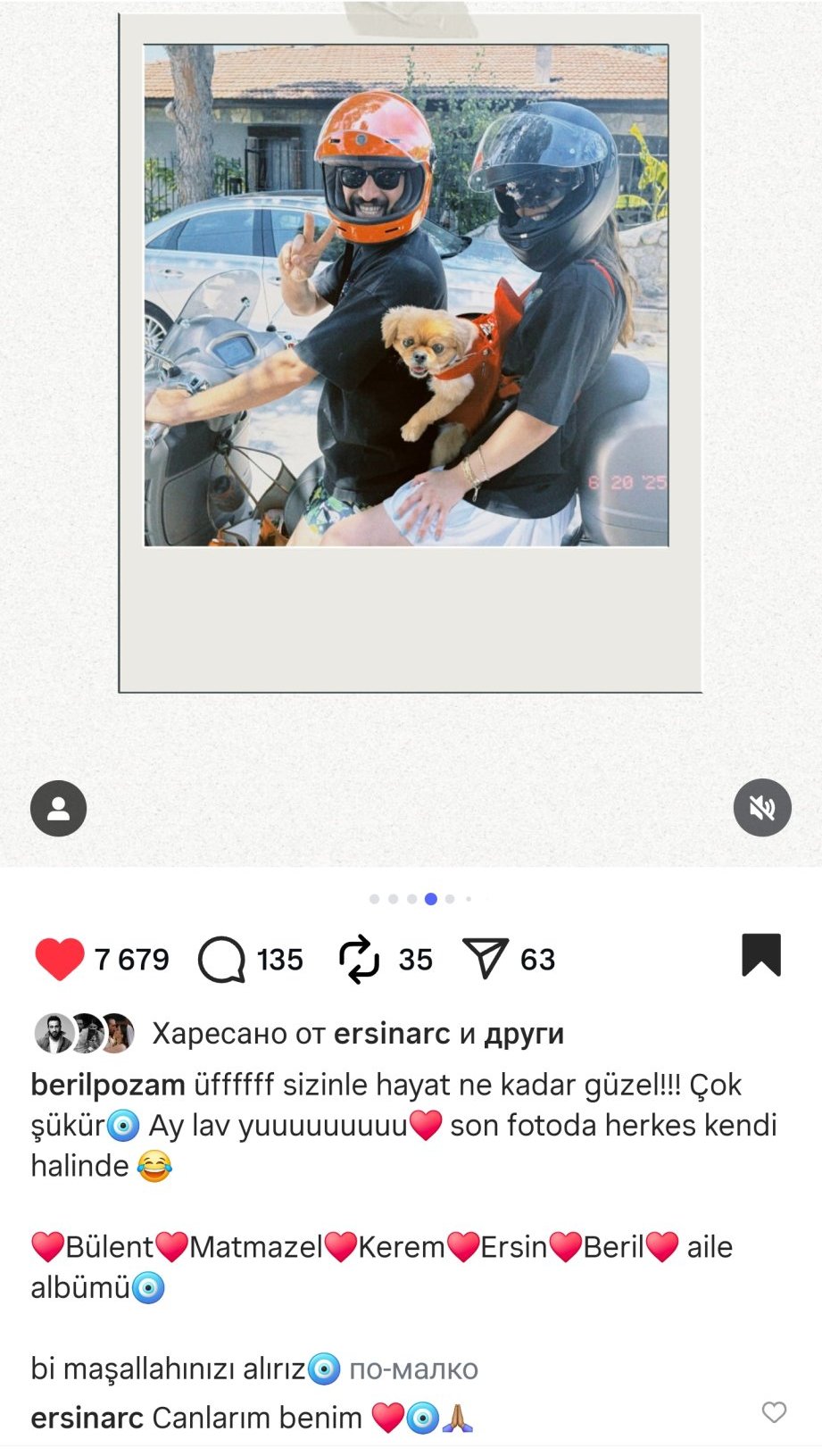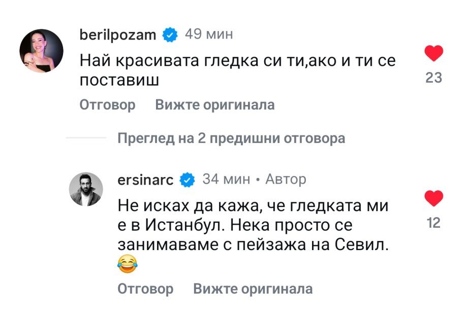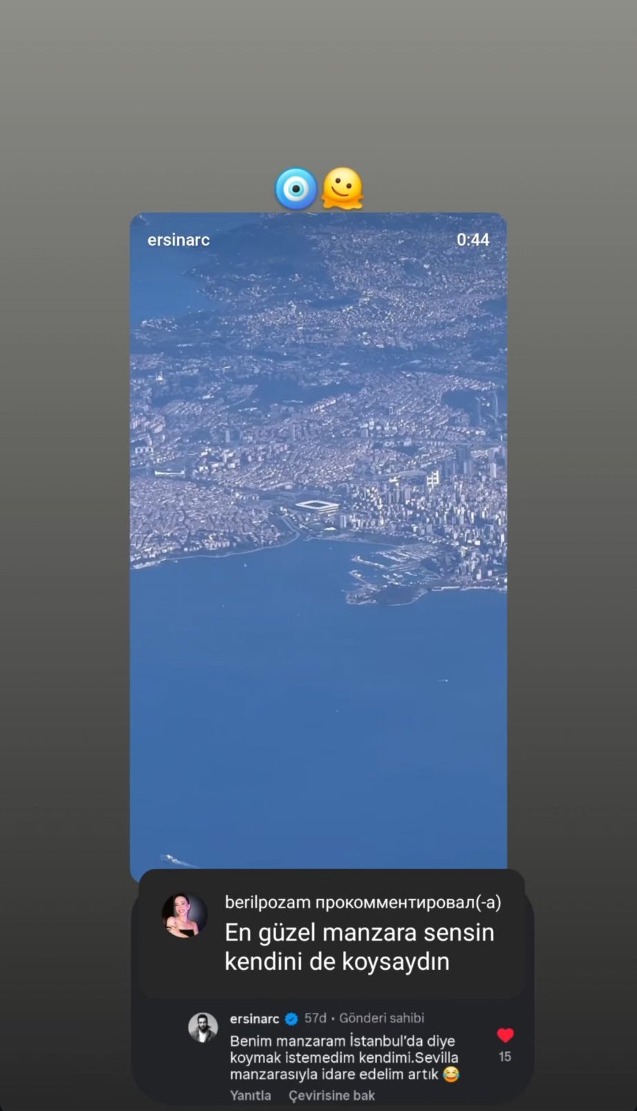 Берил веднага коментира клипа на съпруга си, казвайки че той - Ерсин е най-красивата гледка, после Ерсин отговори на Берил, че неговата най-красива гледка е в Истанбул - т.е. това е тя - Берил!