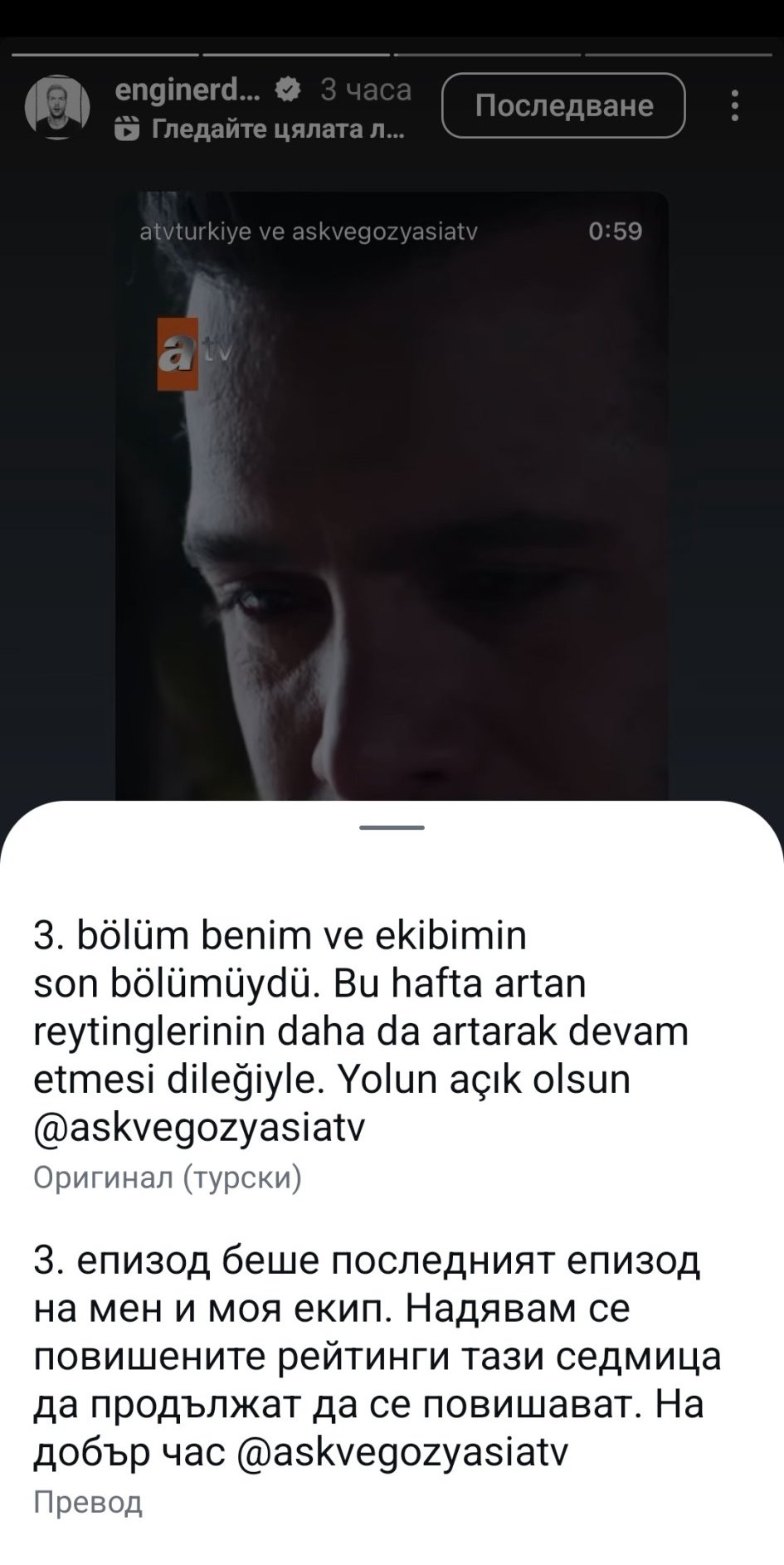 Първо обаче не можах да разбера защо сценариста и режисьора са напуснали и защо аджеба има смяна?! Заради лошите рейтинги от миналата седмица, че са 1 към 1 с оригиналния сериал ли? Много добре започна сериала и ще е много жалко да остане в нищото или пък да го съсипят, защото има огромен потенциал. А, всички знаем, че смени ли се сценариста - всичко отива за боклука. Загубих надежда за този сериал, язък, че го почнах. Жал ми е и за Ханде, че сега това ще се отрази на реномето й.