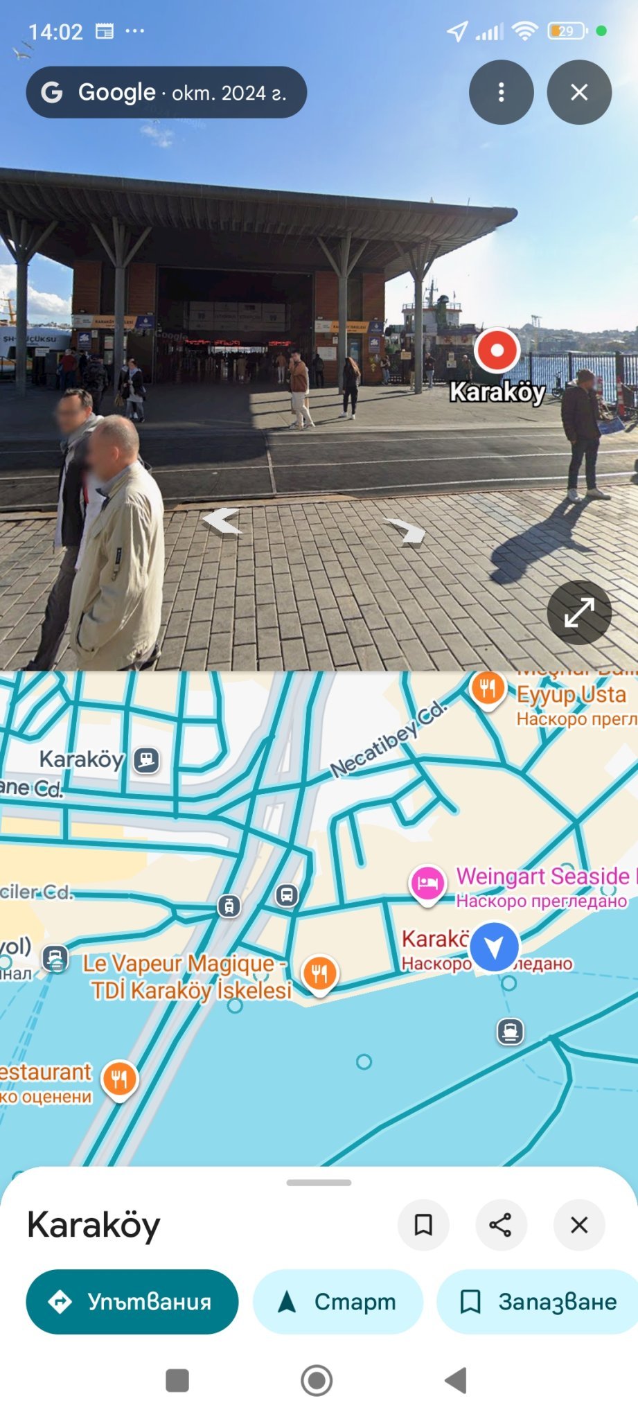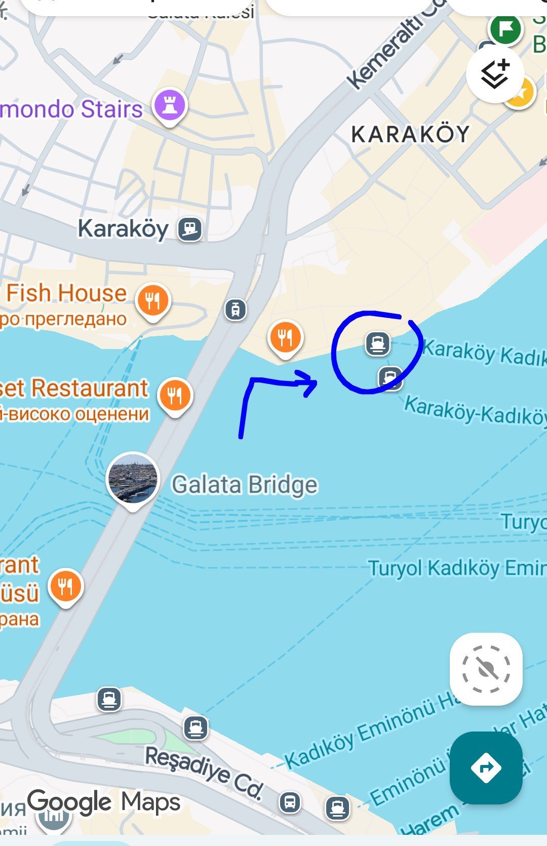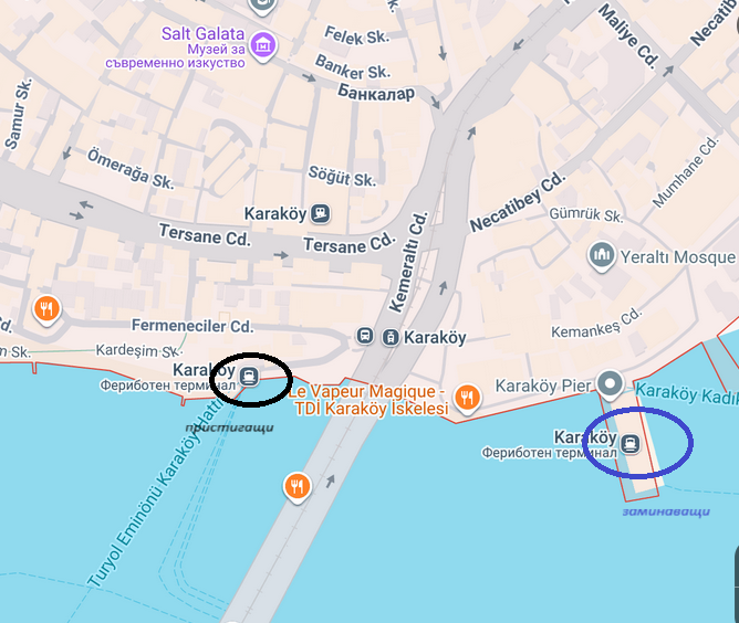 Преди съм ползвала корабче от Хаскьой до Каракьой и слязохме на пристанището от дясно на мост Галата (зад гърба ми остава Египетския пазар). Гледам на картата от двете страни на моста са фериботни терминали и за двата пише  Каракьой. Уф дано ме разбра, май объркващо го написах, сори.
