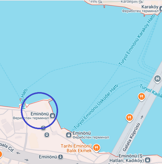От Еминоню тръгвате по моста Галата и като го минете, терминалът е отдясно!