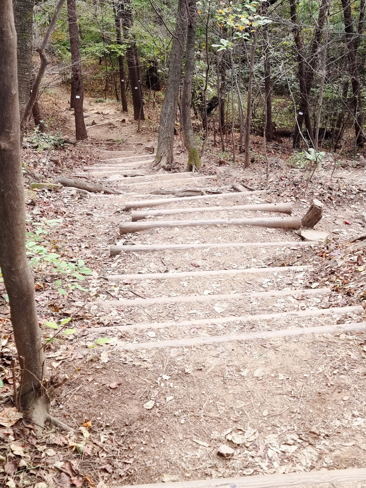 За по-пряко, решихме да се спуснем по билото на хълма, където е кулата. Зададохме на навигацията "лек маршрут, без стълби" и тя ни прекара през едни кози пътеки, с корени и камънаци... а двете с щерката бяхме с неподходящи обувки (меко казано). Бях забравила, че "сан" в името "Намсан" означава "планина". С щерката се шегувахме, че сме съвсем като в исторически сериал, където героинята бяга из гората в ханбок и пантофки и  е преследвана от сюрия стрелци. Това беше сегук-моментът. Докато пълзяхме надолу по склоновете, срещнахме двама младежи, които бягаха (!) по насечения терен. Изгледаха с любопитство двете заблудени туристки и ни подхвърлиха по едно ободряващо "файтинг!" . Това беше драма-моментът 😂. Накрая се добрахме до прословутото кафене и трупясахме на кафе и тортичка. А кафенето е само на 240 метра (проверих го!) от къщата на Любимия Ю. Това беше почти Ю-моментът.😍