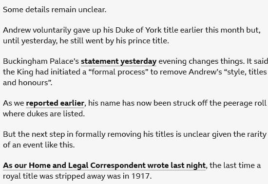 Голямо нищене на тия титли. За мен е по-важно, че има действия, показващи реакция.  За тези хора титлата е идентичност и лишаването от нея по какъвто и да е начин е унизително (в техните очи). Заслужава си Андрю, каквото си е надробил. Пише, че ще се премести в частен имот (аз го разбирам на семейството, не на короната).