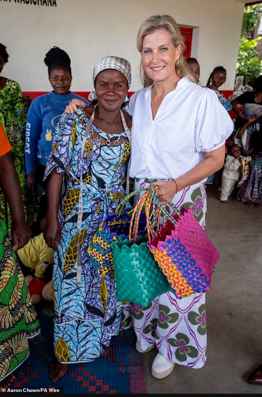 Софи получи чанти като подаръци, изработени от жени в безопасно пространство за жени в Бени, Демократична република Конго, където във вторник тя общува с жени, засегнати от конфликти и разселване в източна ДРК.