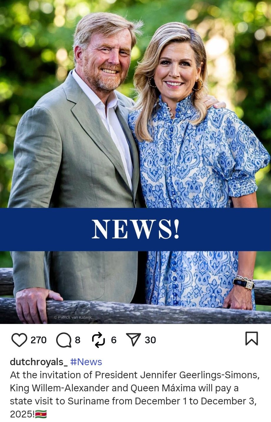 Кралят и кралицата на Нидерландия ще бъдат на държавно посещение в Суринам през декември