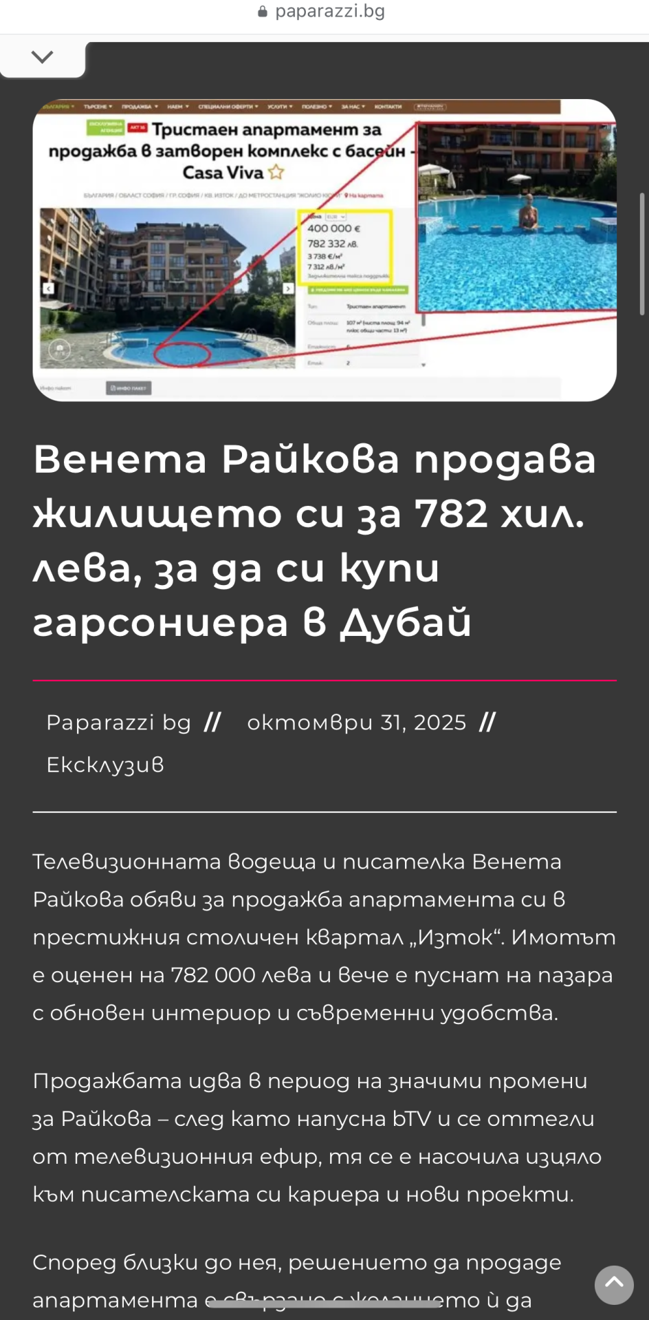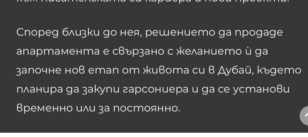 Не знам дали по-назад сте коментирали, но чета някаква статия, в която твърдят, че Венета продавала апартамента си, за да се мести в Дубай. Дали е истина?