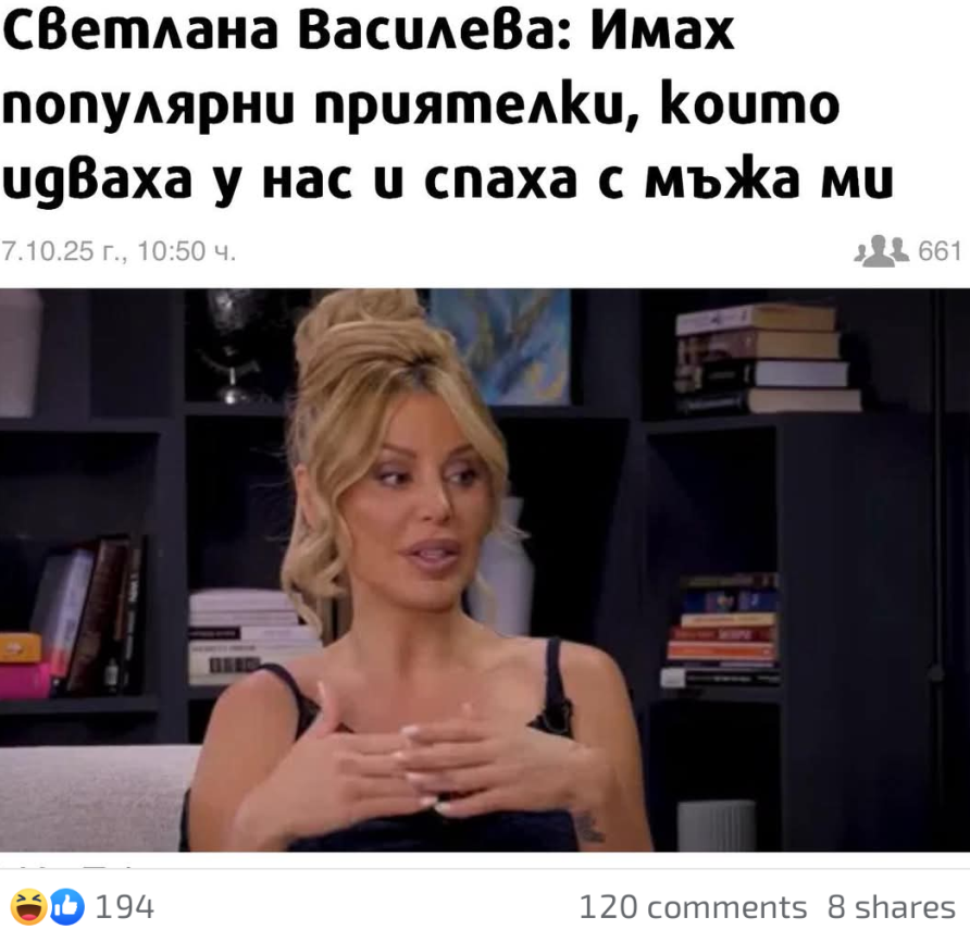 Ох, горкия Светланин мъж... Идват ония ми ти приятелки, и го насилват, насилват, а той се дърпа, дърпа... Много лоши жени, ужас!
