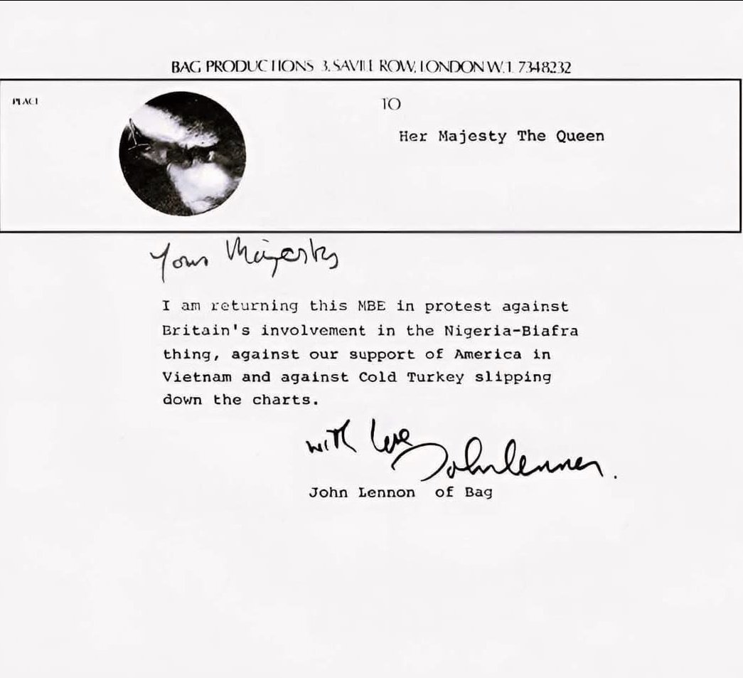 Джон Ленън връща медала си през 1969 г. в знак на протест срещу участието на Великобритания в гражданската война между Нигерия и Биафра, както и заради несъгласието си с подкрепата на Англия за Съединените щати във войната във Виетнам. Ленън опакова медала в бял плик и го изпраща обратно до Бъкингамския дворец чрез шофьора си.