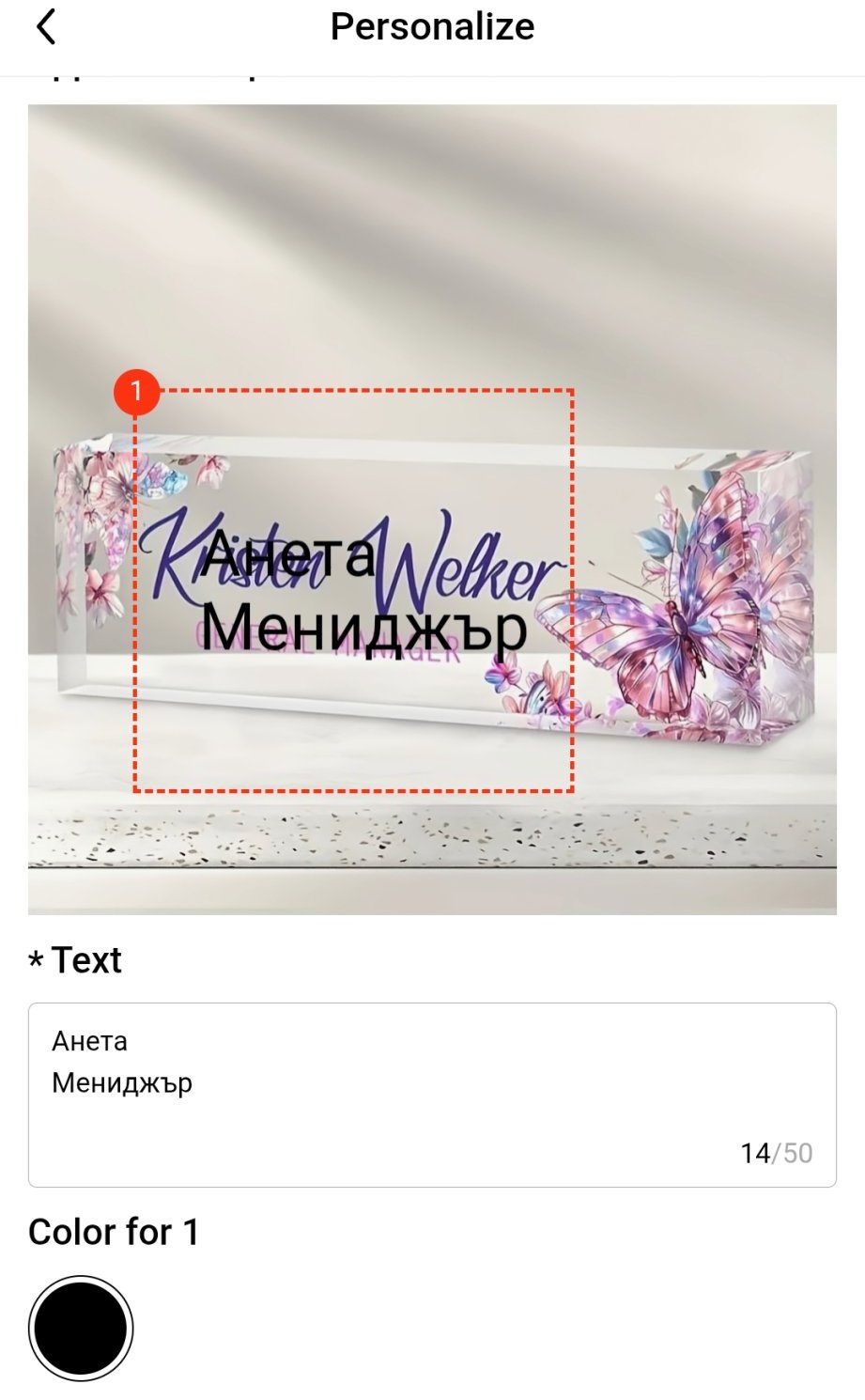 2. Ще поръчвам персонализирана таблетка. Така ли се изписват името на човека и това, което искам да пише под него? Дава ми отгоре да го местя, да го уголемявам и смалявам...просто се притеснявам да не се обърка.