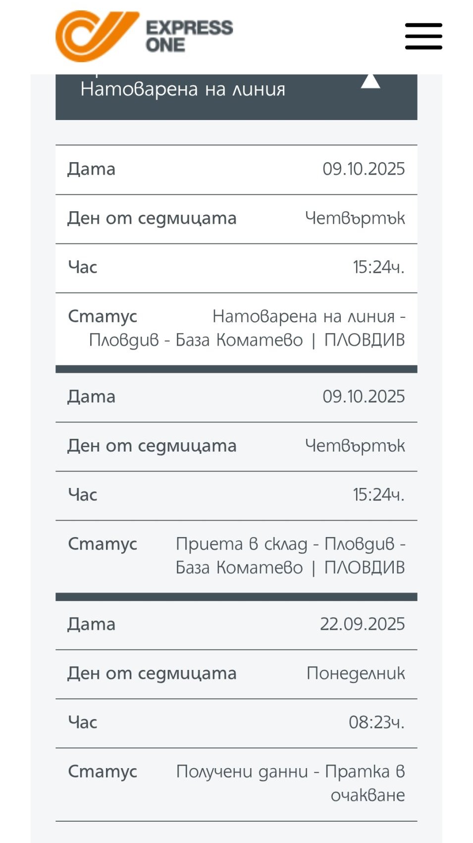 В Експрес Уан пратката ще стои на този статус през 99% от времето докато се движи. Статусите ги гледате в Тему сайта. Там има много движение което не се отразява в експрес уан.