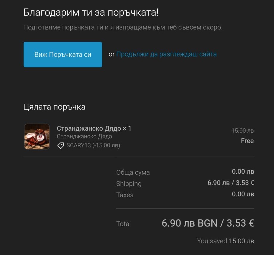 Поръчах си един колбас,цената му е 15лв, с код SCARY13 плащам само доставката на Еконт.