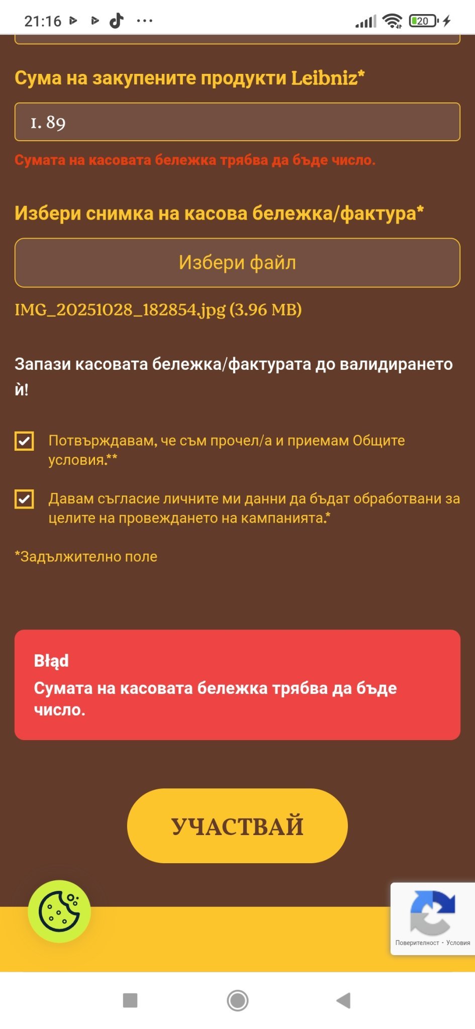 Здравейте, купих бисквитки Leibniz  и се опитах да се рег. за играта. Но, не успях.