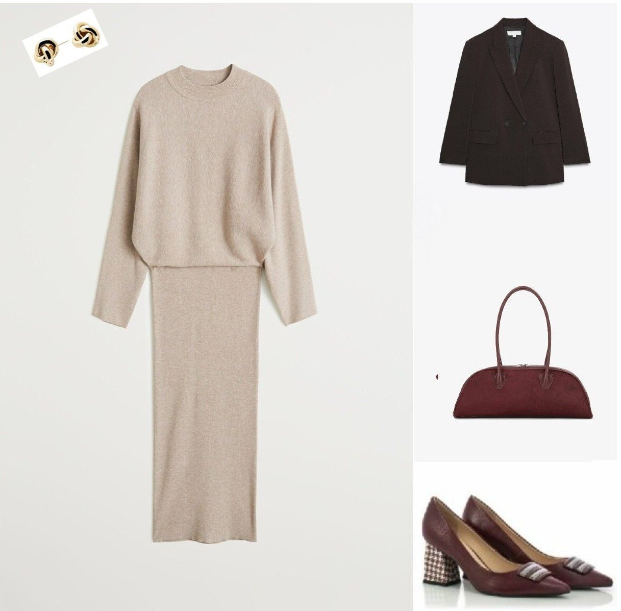 Ани, направих ти едно колажче, да онагледя идеята си за светло бежова рокля към кафявото сако и обувките-бордо. Роклята е Манго, чантата е примерен модел:
