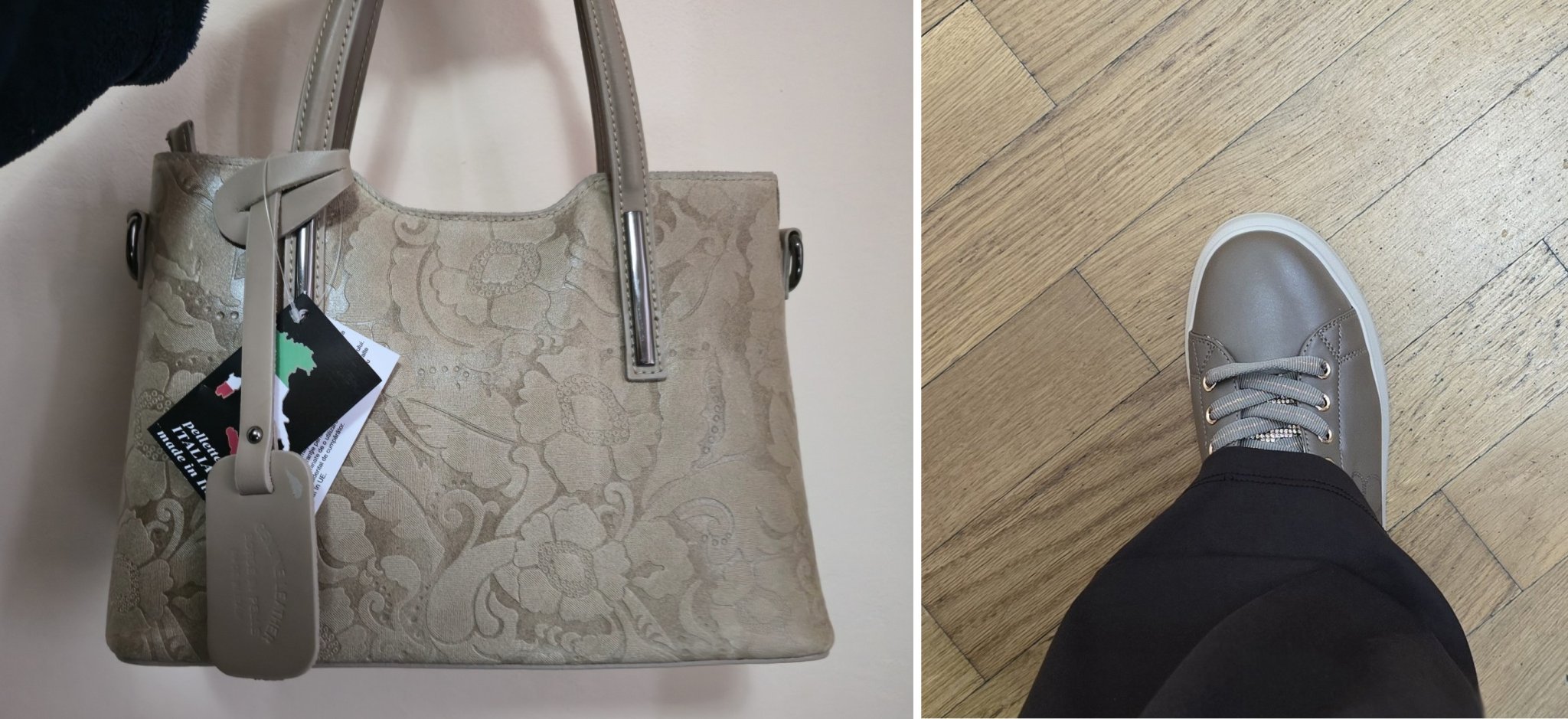 Купих на приятелка за РД тази чанта, която цветово е съвместима с обувките на Ани, но стилово май хич не е... Или пък защо не?! Все пак да покажа, естествена кожа е