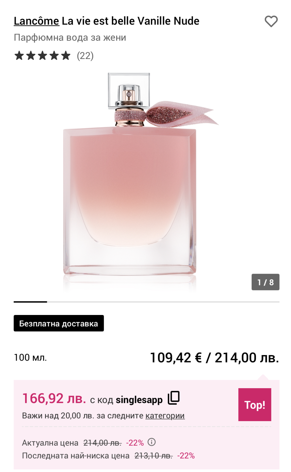В Нотино, Lancôme La vie est belle Vanille Nude с код singlesapp идва на 166 лв, има и подарък несесер