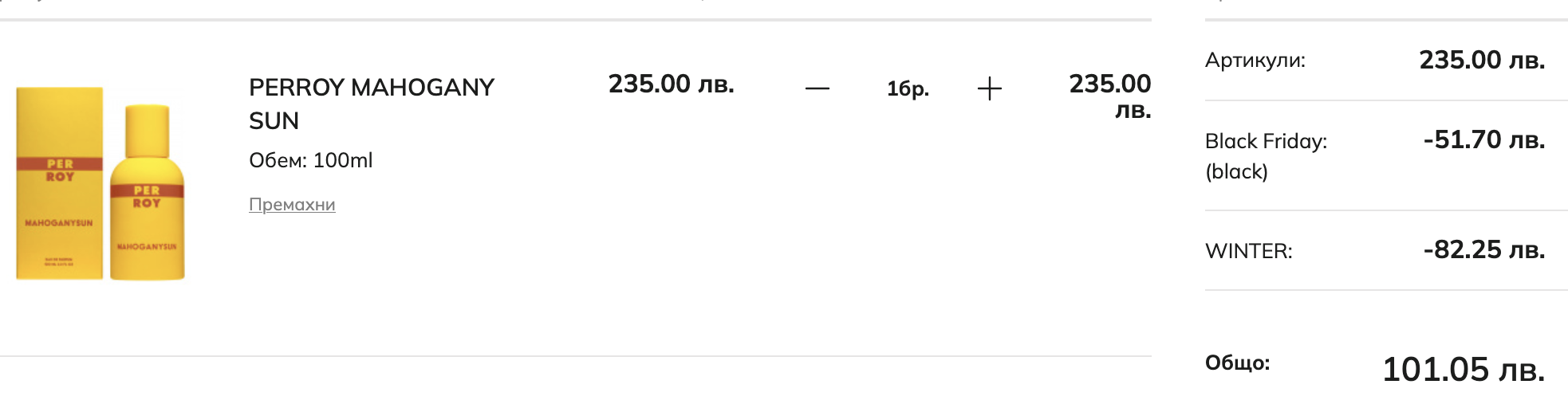 Цените на Perroy в Елинор са мноooго по-добри, отколкото в Озон.  Код WINTER се прилага автоматично в кошницата, добавяме black и цената намаля с 57%.