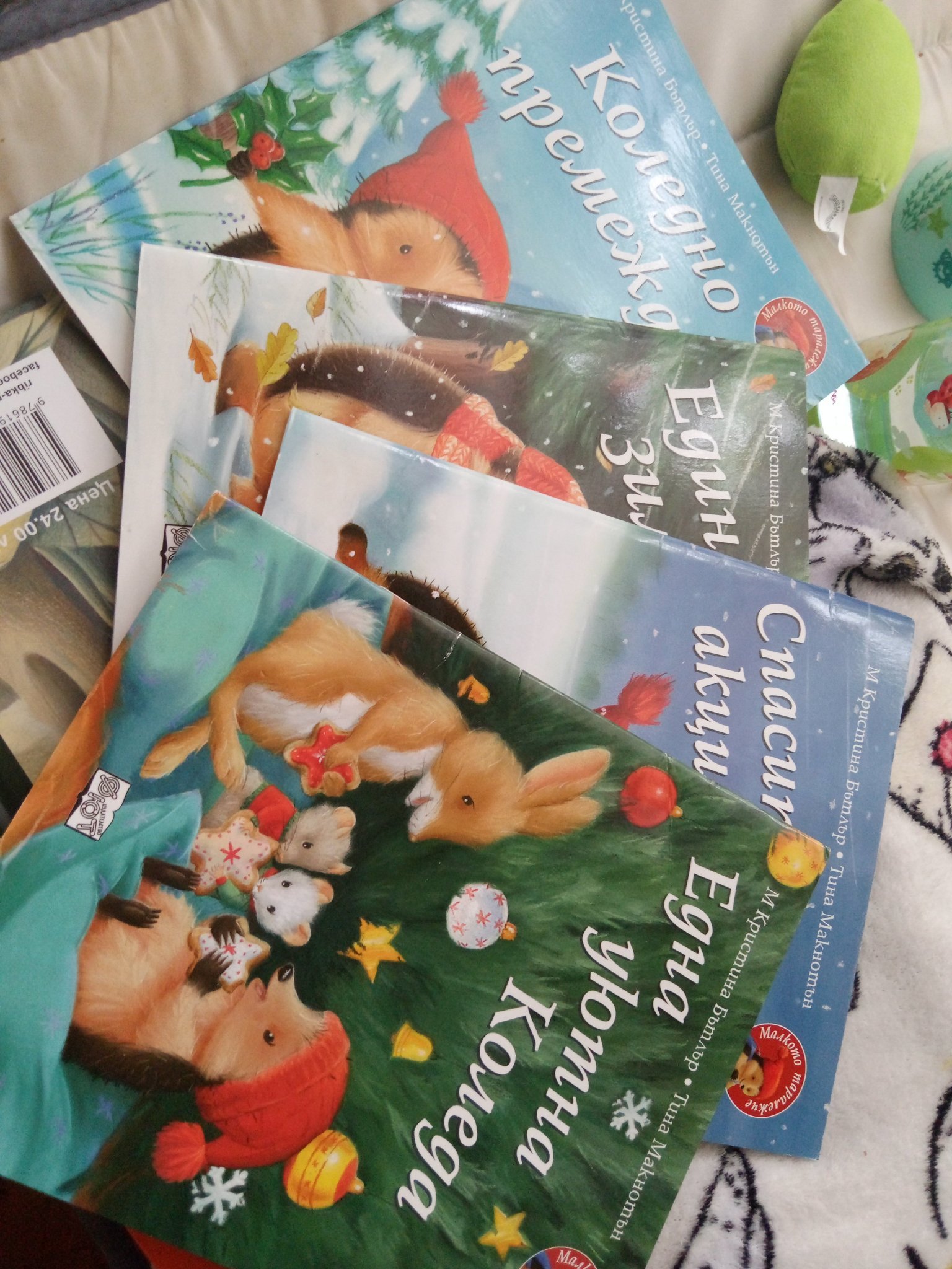 За малкото момиченце - историите за зайчето Питър, а също и за таралежчето Ежко - много мили истории, в които приятелите винаги си помагат, една червена шапка е много важна , Коледа винаги е споделена и уютна и картинките са много красиви