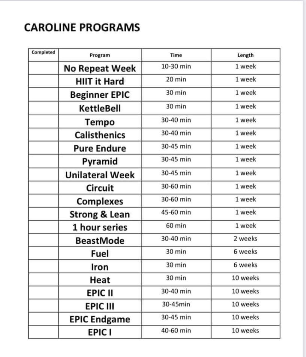 Ирка пускам табличка с програмите на Каролайн в ютюб. Само Коледната не е в списъка. Добър ориентир е за продължителност на тренировките. Аз почнах Fuel след Iron и ми харесва много повече от Iron.