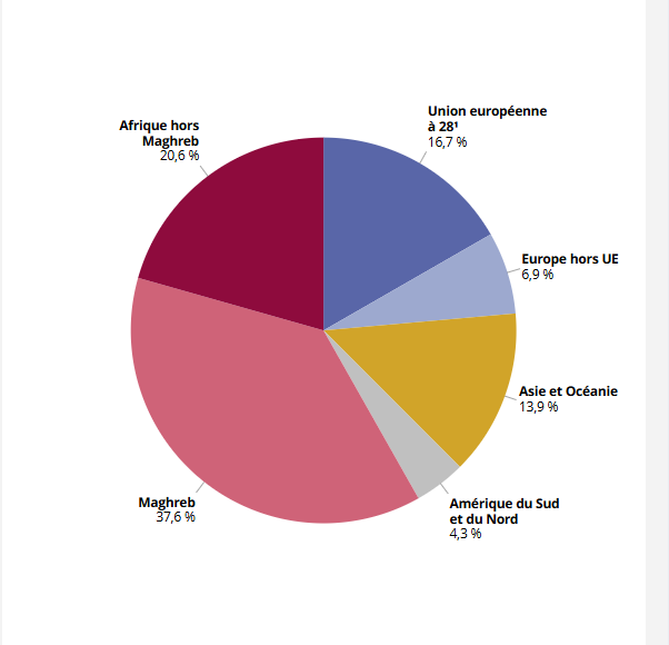 Пак според  Insee, за 2019, aко се вземат всички чуждестранни престъпници, идващите от северна Африка (Магреб), Черна Африка и Азия преставляват около 75% (графика2). Същевременно емигрантите от тези райони са около 50% от всички чужденци във Франция.