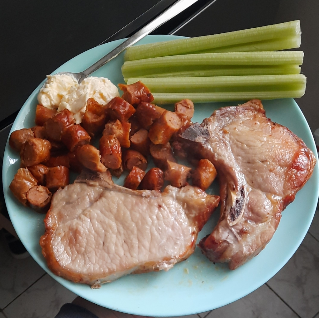 Без никакви подправки или мазнина ги пекох, защото от ВиК ни устроиха "забавление" и нямахме вода цял ден.😂 Та с найлонов плик ги метнах в уреда (да не се цапам) и с нищо не ги овкусих. Само след печенето поръсих със сол. Другото в чинията е селъри (добре че имам в кутия в хладилника измито и подсушено) и 30 грама домашна майонеза като сос за пържолките.