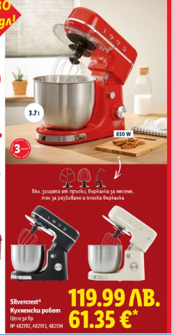 Робот е доста силно казано. Миксер, с въртяща купа, 650 вата с три вида бъркалки.