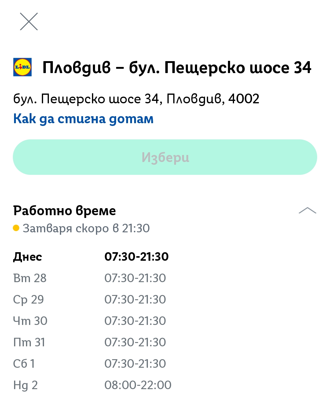 Късно ми се вижда. И Била, и Кауфланд до този филиал отварят в 7 в неделя, а Лидл са го сложили от 9:30.