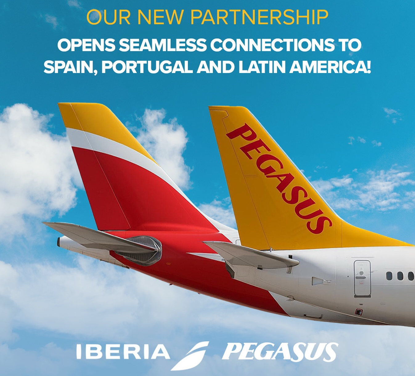 ПЕГАСУС в сътрудничество с ИБЕРИЯ пуска полети и до Лисабон, както и още 11 испански града с прекачване в Мадрид.  За Сао Пауло - Бразилия, вече споменахме по-горе.