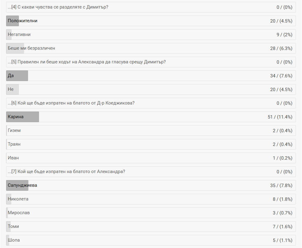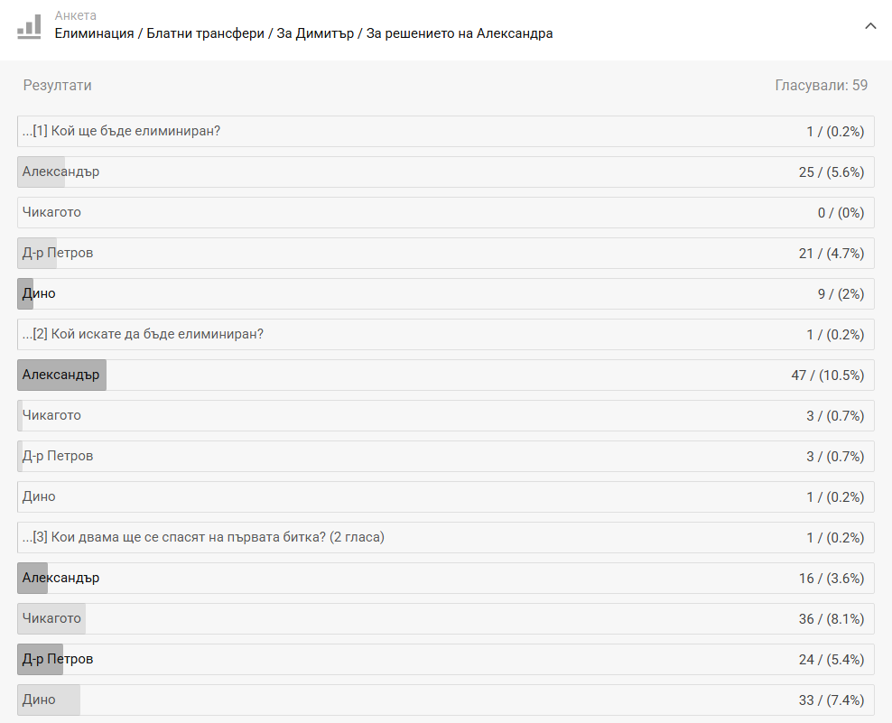 КРАЙ! Битката приключи! Александър заслужено спечели. Браво и на двамата. Мъжка битка. Не се отказаха и двамата до последно. Александър получава 100 гроша и продължава бората. Д-р Петров си отива вкъщи.