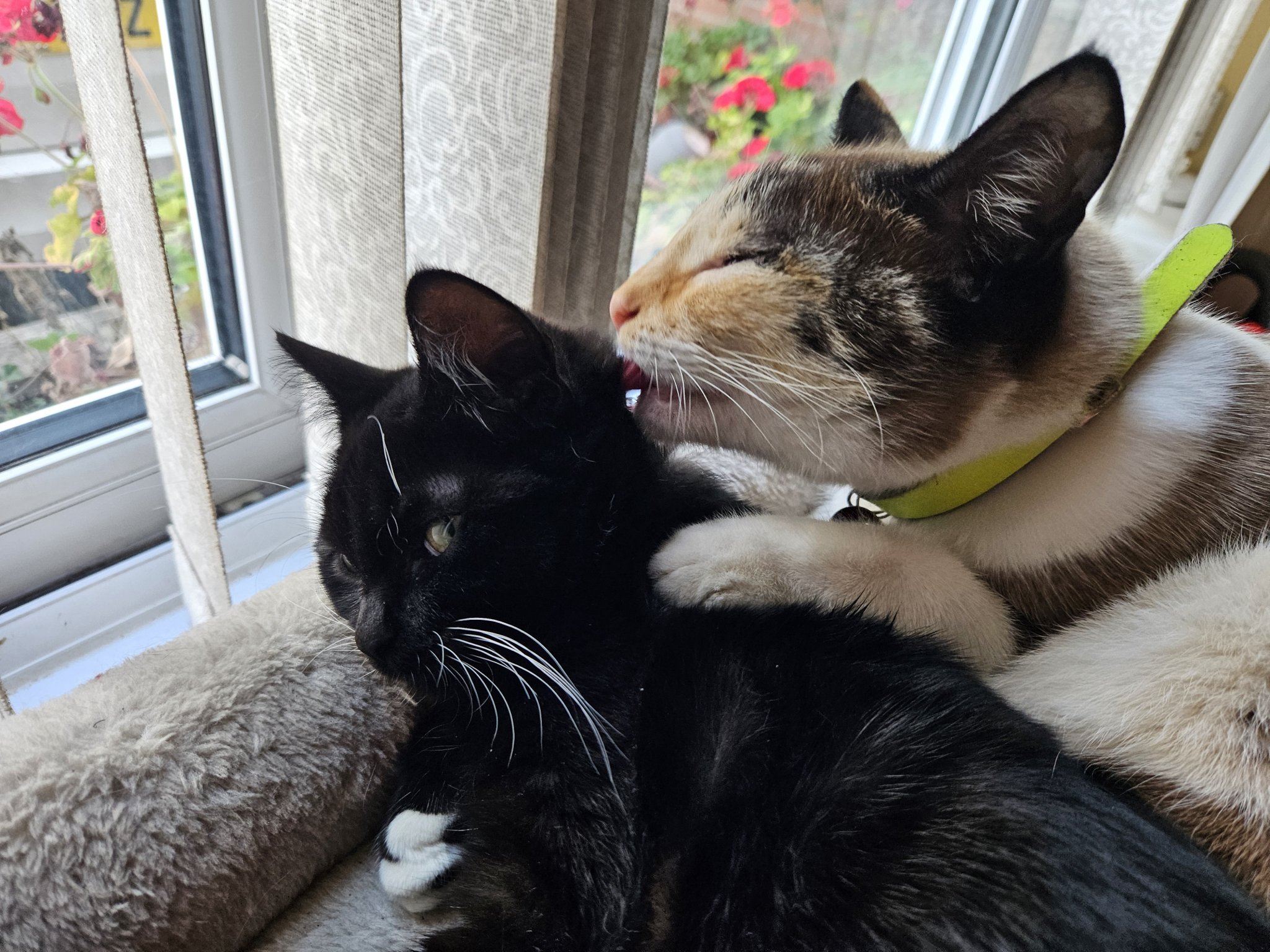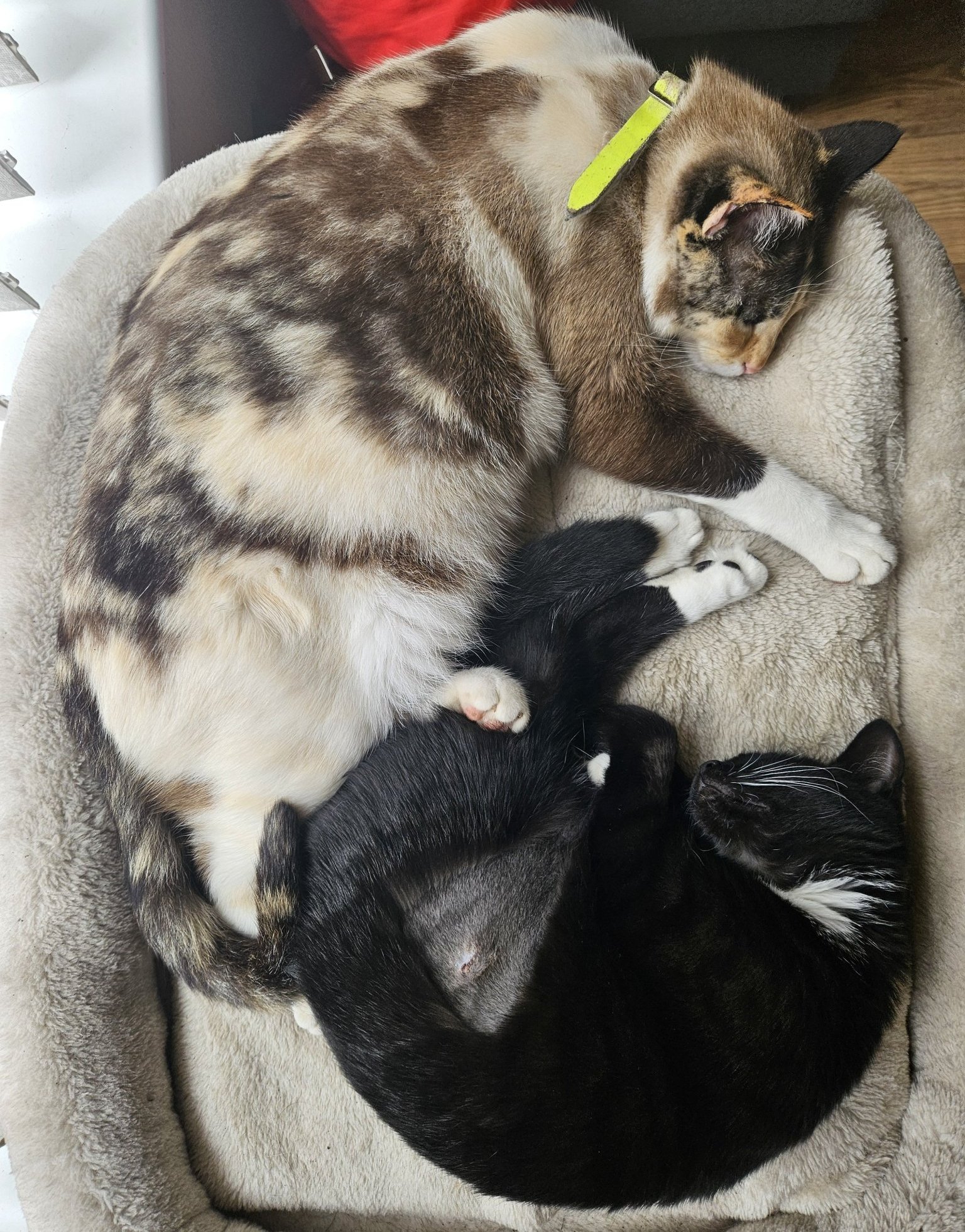 Нищо не са казали, носят си ги. От малки са свикнати с каишки. Противопаразитни, но също и светлоотразителни в тъмното - излизат навън и е важно, когато дните са къси зимата. Въпреки че обикалят основно задните дворове, Цура съм я засичала два пъти да е на улицата. На каишката виси и медальон с моите данни (така се свързаха с мен, като кола удари Маца), както и пише, че са чипирани и кастрирани. Виси и еъртаг, понякога се налага да ги търсим - само Цура, в интерес на истината, която половината пъти се скатава в двора на съседите, или мълчи като партизанин, затворена в бараката. Без тракера може доста време да не разберем къде е. Минка носи тракера за красота, защото като чуе сигнала за храна, и барака няма да я удържи.