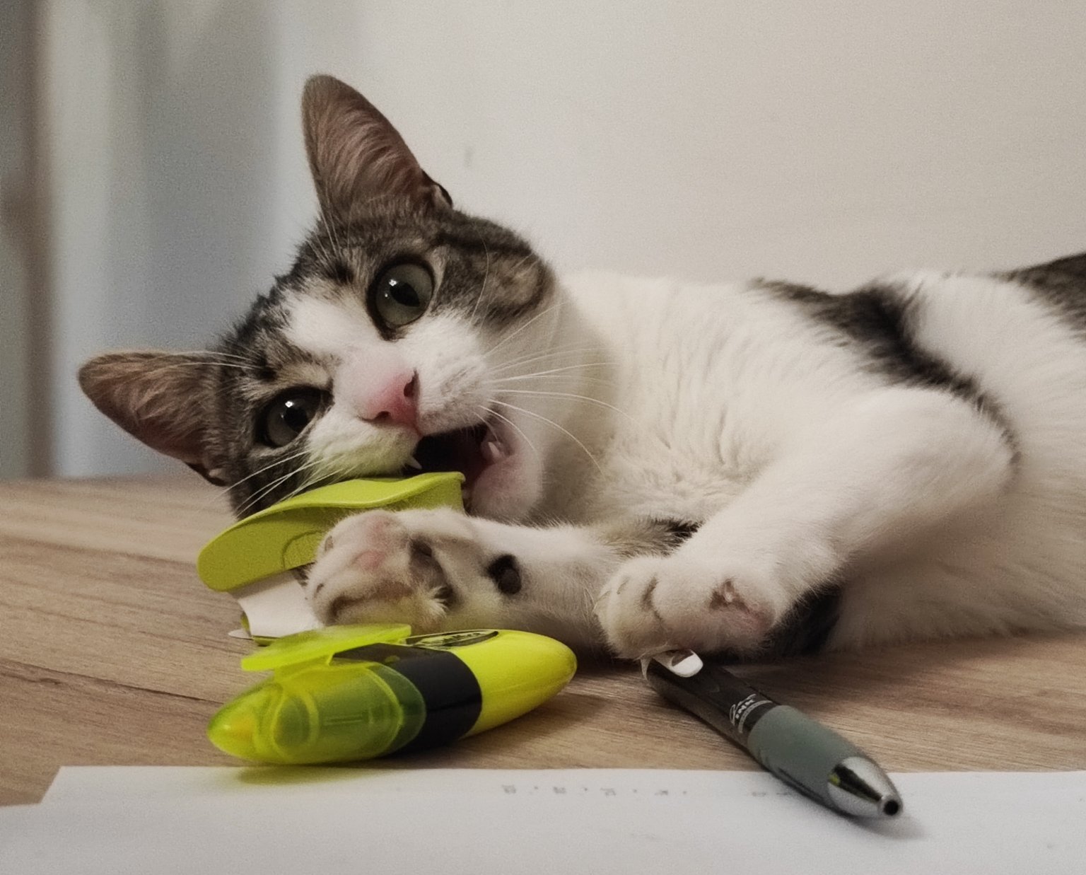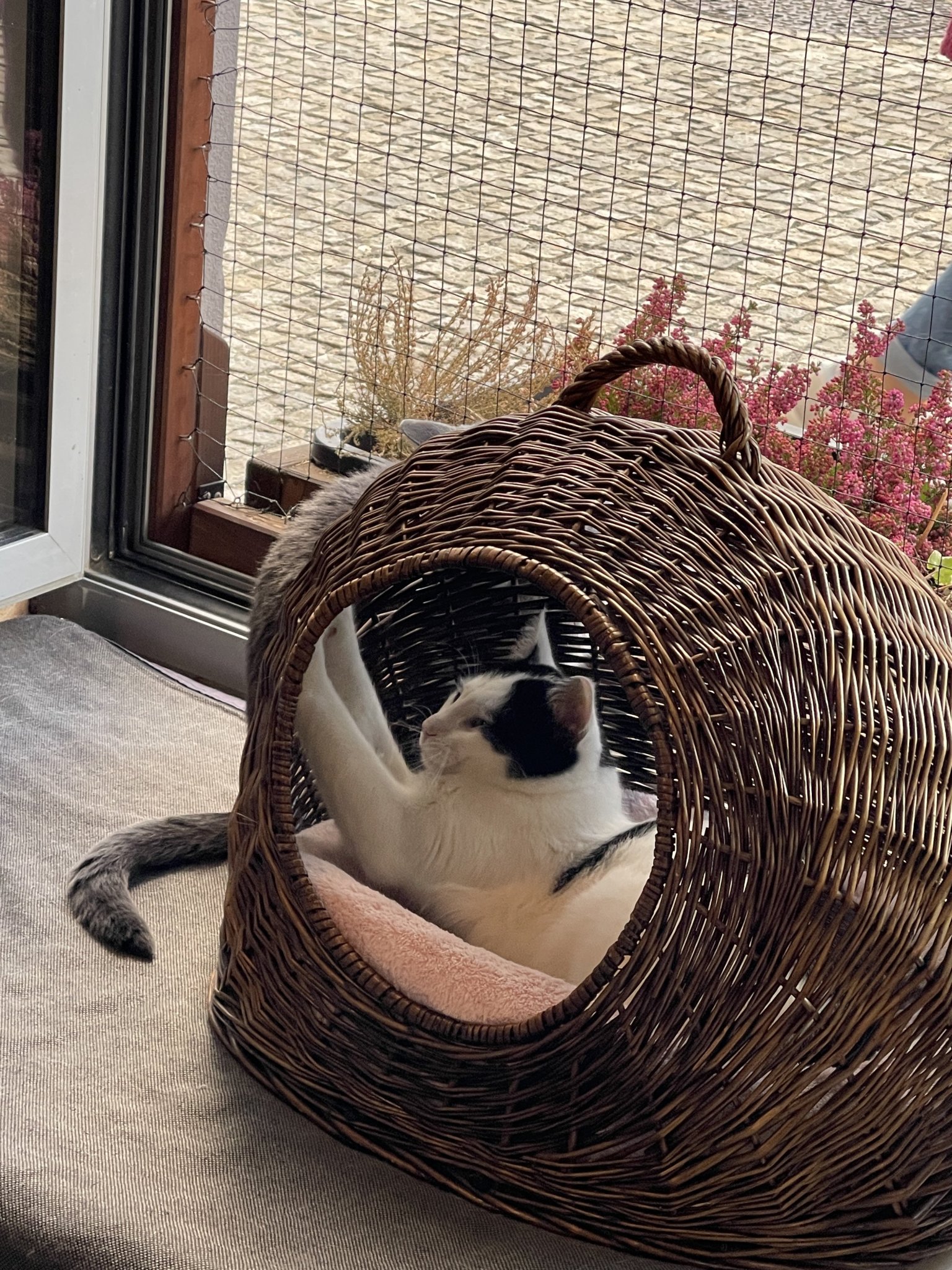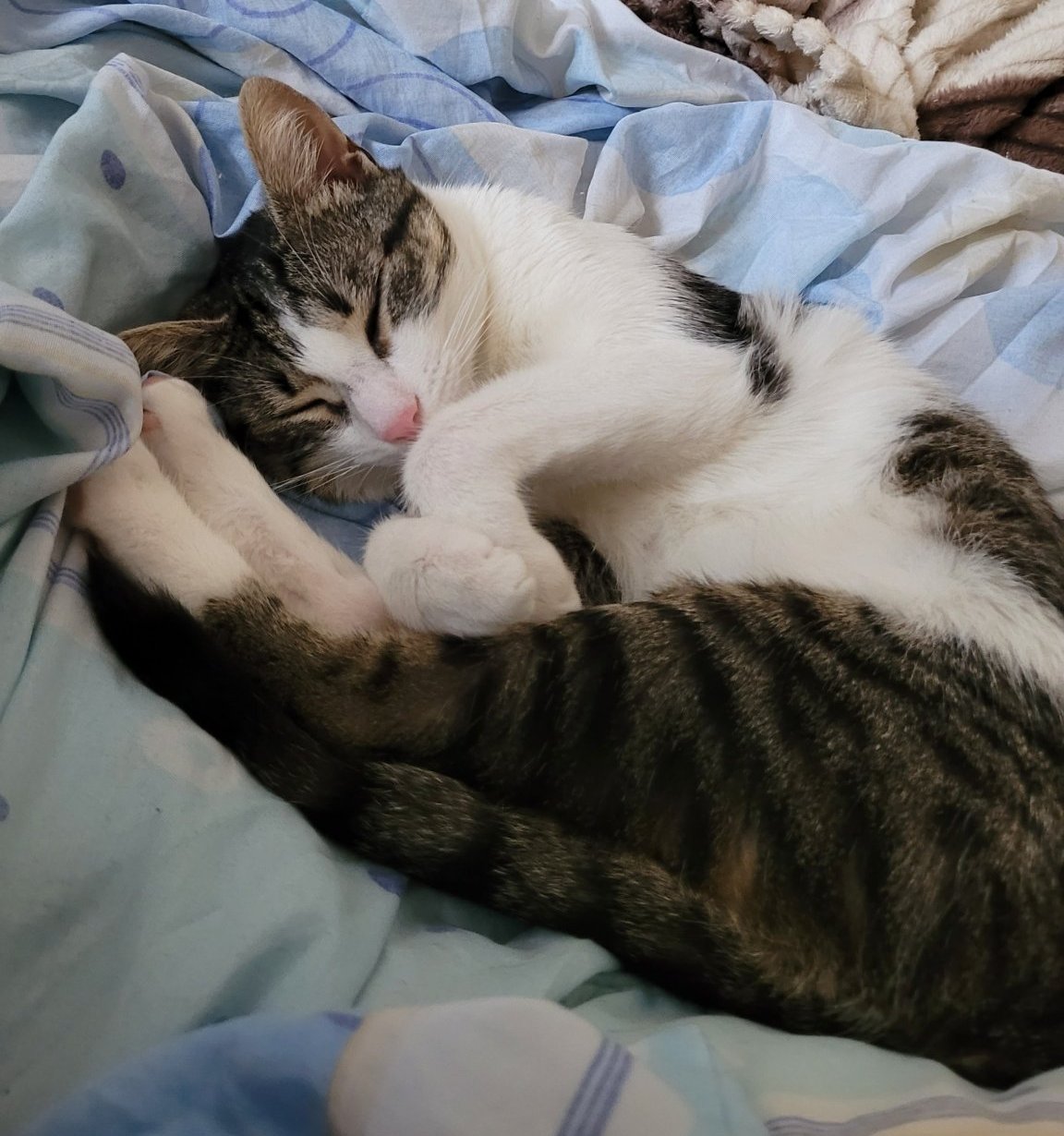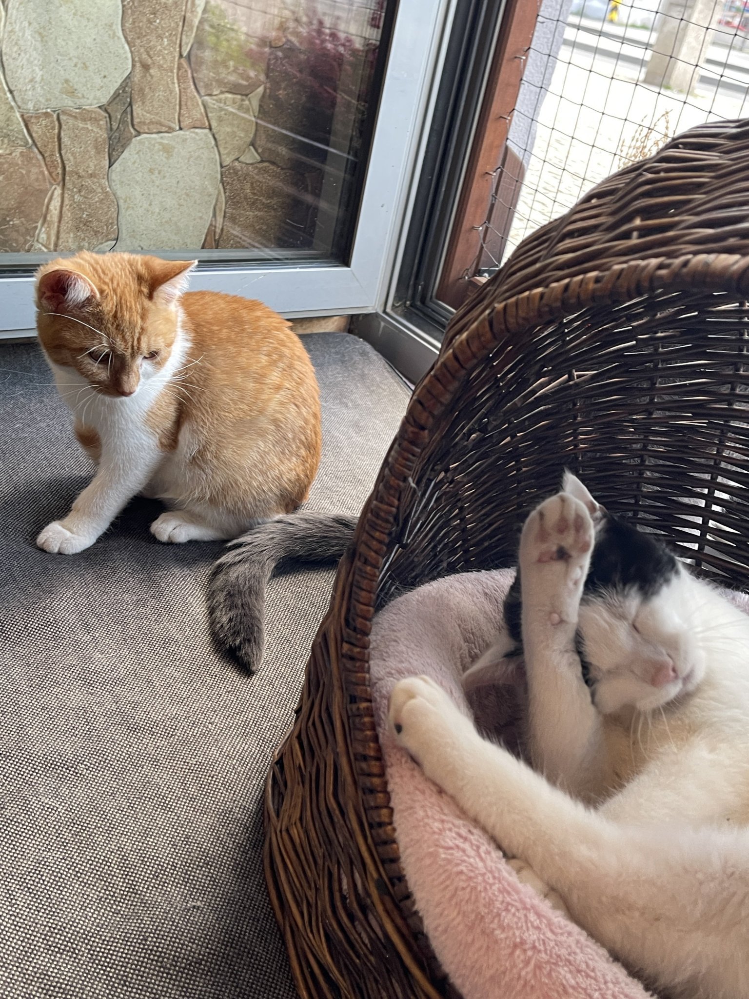 Малката много бързо ме опозна, посреща ме, гали се, смело защитава храната, която и слагам, дори удря лапа на майка си, ако се присламчи. Принудих се да ги храня разделно. Големият котак е най страхлив.