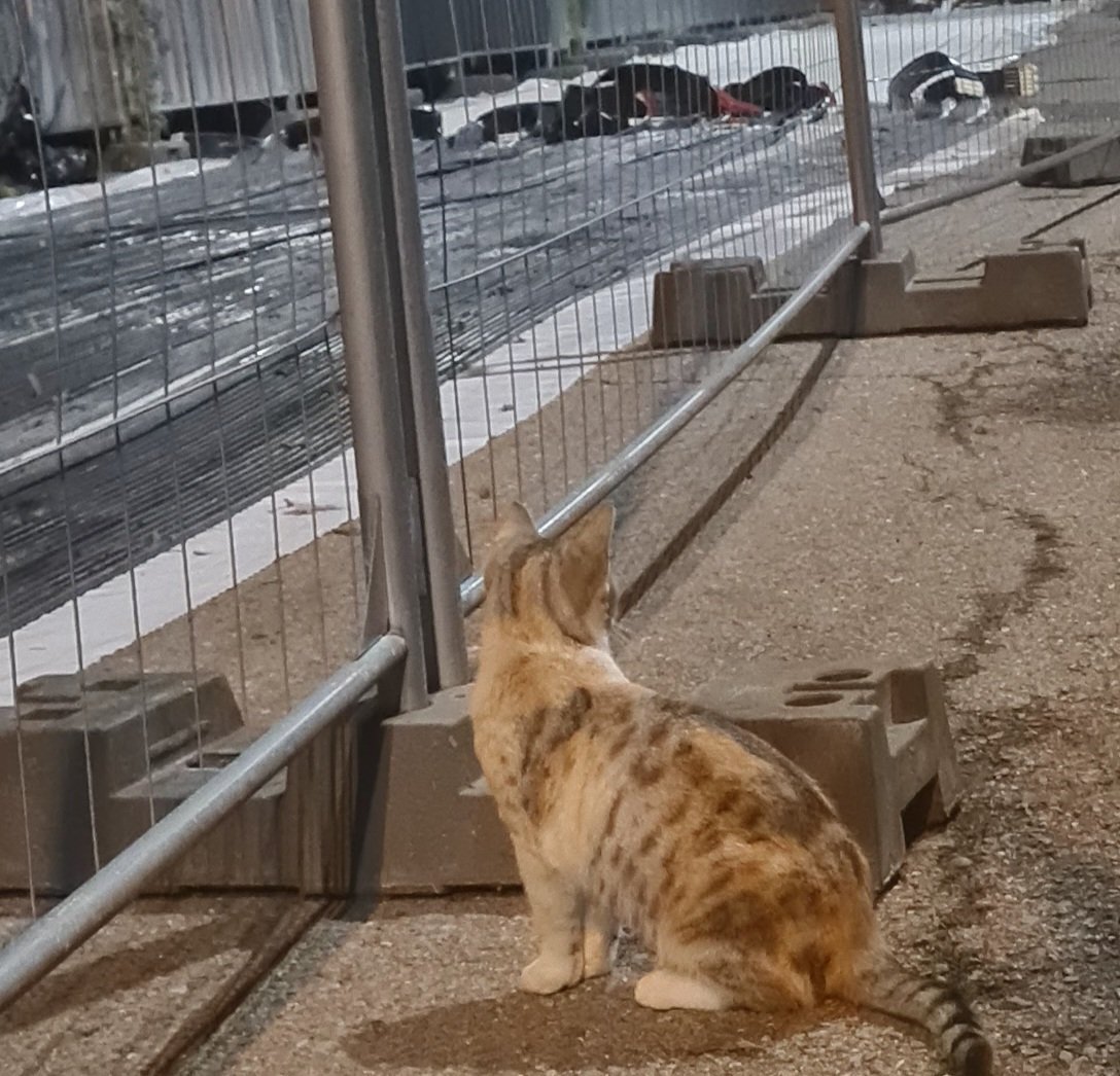 Аз да си похваля моето улично коте, много бързо научи името си. Както писах, около ограждението в което живее, строят пързалка - голям проект, ще стане огромна