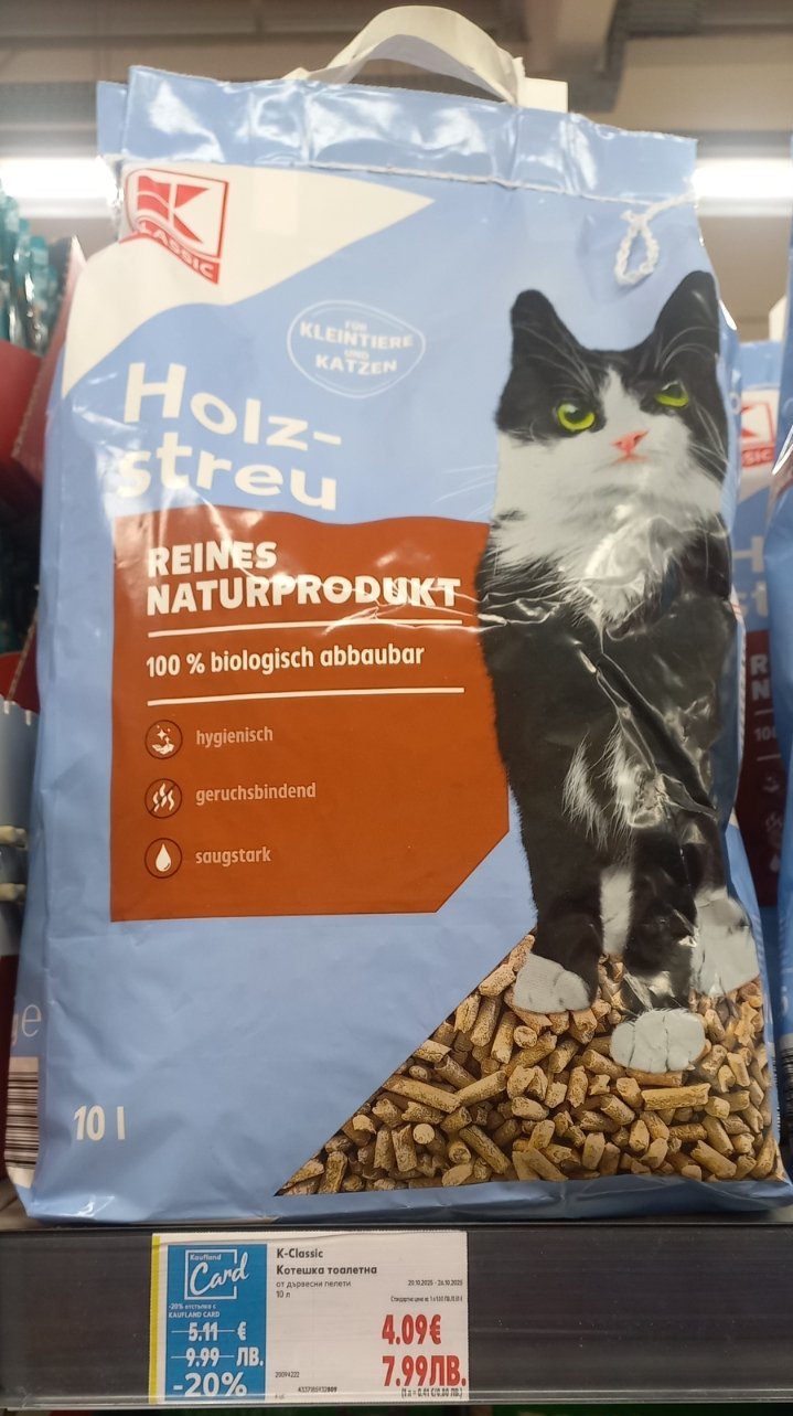 При котешките неща си е, но я няма във всички магазини. Онзи ден я гледах пак, но не разбрах от какво е направена. От тази седмица има и пелети за огрев, но са на друго място и чувалите са огромни 15 килограма за 9 или 10 лв. Ако са еднакви огромните чували излизат повече на сметка.