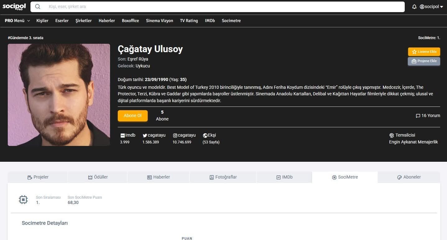 Чаатай Улусой е класиран на 1-во място тази седмица в Socimetre, който класира турските актьори само въз основа на техните изпълнения в телевизия/кино/дигитални и социални медии.