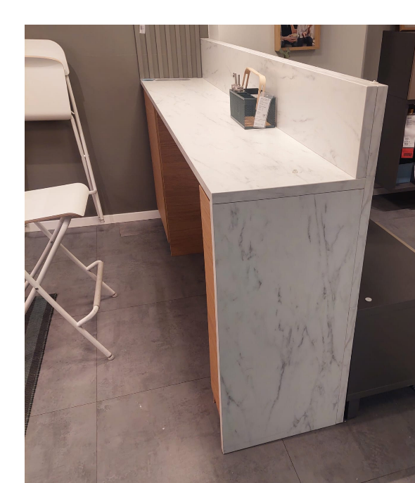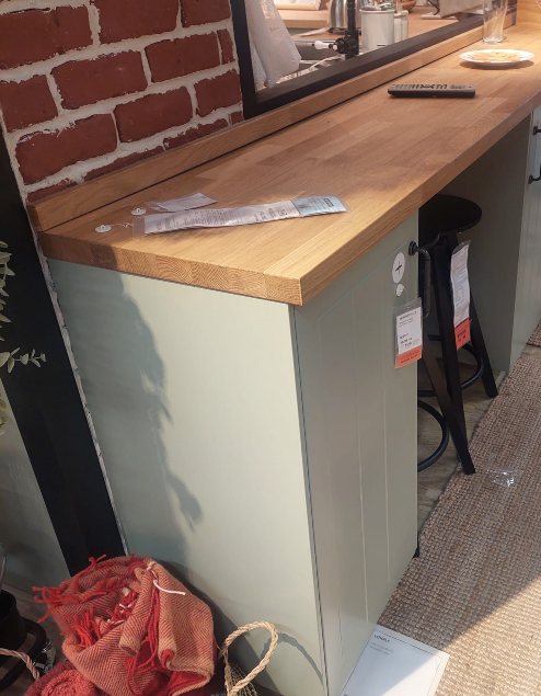 Ето такъв бар ще разположа до кухнята, на разстояние 80см от нея (мерих в Икеа и там е оставено толкова разстояние). Ще го направя 140см на 40см широк, в Икеа е малко по-дълъг, но на мен ми стига едно шкафче от 40 см и след това 100см за бар, под който ще мушна двата стола, също както в Икеа.