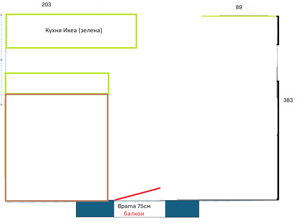 Така решавам няколко въпроса с един удар - първо имам две места за хранене, после допълнителен плот и накрая гърба на бара ще служи за табла на леглото, което ще разположа зад него. Там е по-удачно, защото хем балконската врата няма да му пречи, хем се формира с табла, хем не се разминават широкото легло и широкия бар, така цялата друга страна на студиото остава за оформяне както си реша. Ще помисля още малко дали да сложа диванче, дали кресло + фотьойл...място ще имаа предостатъчно, че даже за някоя помощна масичка/етажерчица ще има.