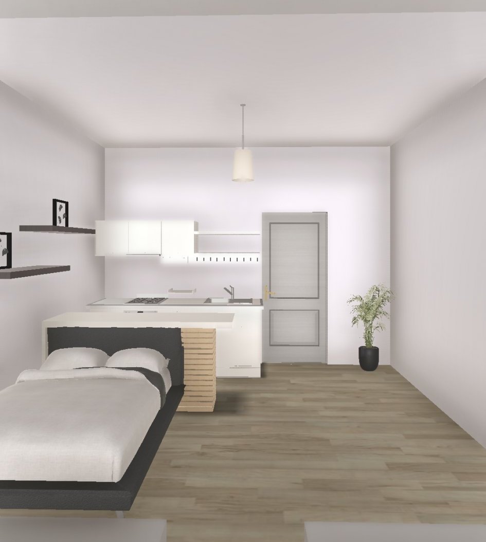 Ако ще се готви в това студио, а няма да се разчита главно на готова храна, аз бих отдалечила леглото от бар плота и кухнята. Или поне бих вдигнала гърба на плота на по-голяма височина - 20 см са много малко за предпазване. Напр. по-висок гръб може да служи от другата страна (откъм леглото или диван, каквото се прецени да се позиционира там) за стена на картина или пано, дори то самото може да бъде оформено като артистично пано.