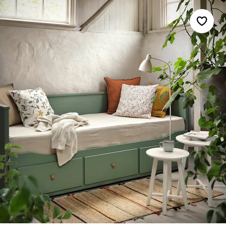 Икеа Hemnes кушетката е чудесна и аз също бях тръгнала от нея, но се разтяга на 160 см и ситуацията с балконската врата ме отказа. Няма кушетка на 140см или поне аз не намерих, иначе е много красива и даже цветовете са ми префектни, а спането е удобно, понеже отдолу е матрак.