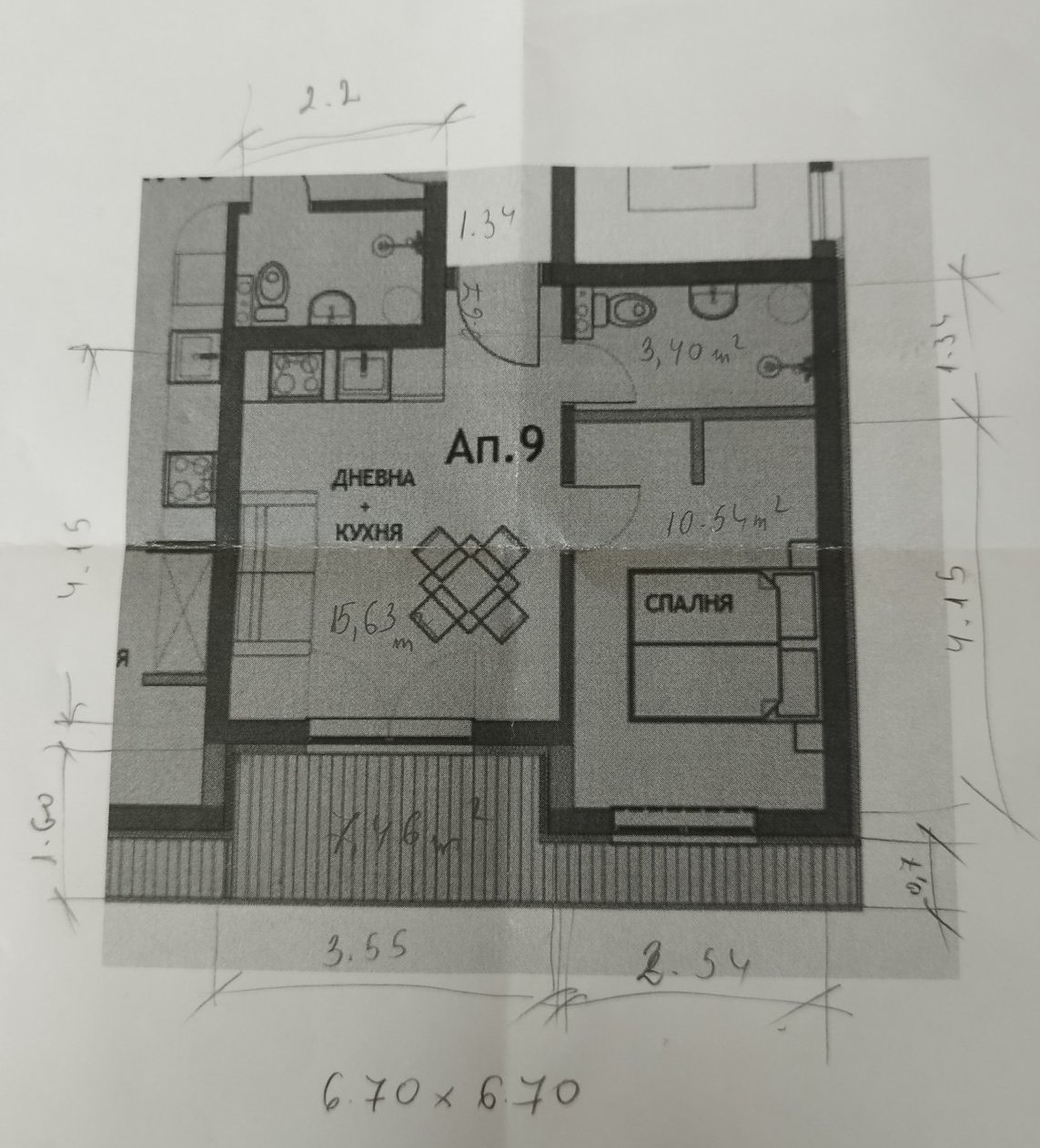 Разместих местата на дивана и масата със столовете. Така между масата и кухнята да сложа хладилника и да се обслужват от двете страни. До стената да е съдомиялна 45 см. После мивка и накрая котлоните. И пералнята нещо средно между банята и спалнята.