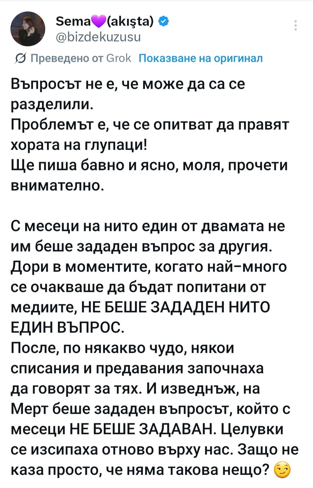 Аз съм склонна да се съглася с поста от Фейсбук. Говорят един през друг и това "битти гитти артък" не е ясно на коя реплика е отговор. Но пък от друга страна, щом повечето са преценили, че това е отговор на въпроса за Мерт бей, нека да е така. Дано спрат вече да ги питат за личния им живот. Макар да се съмнявам Joy