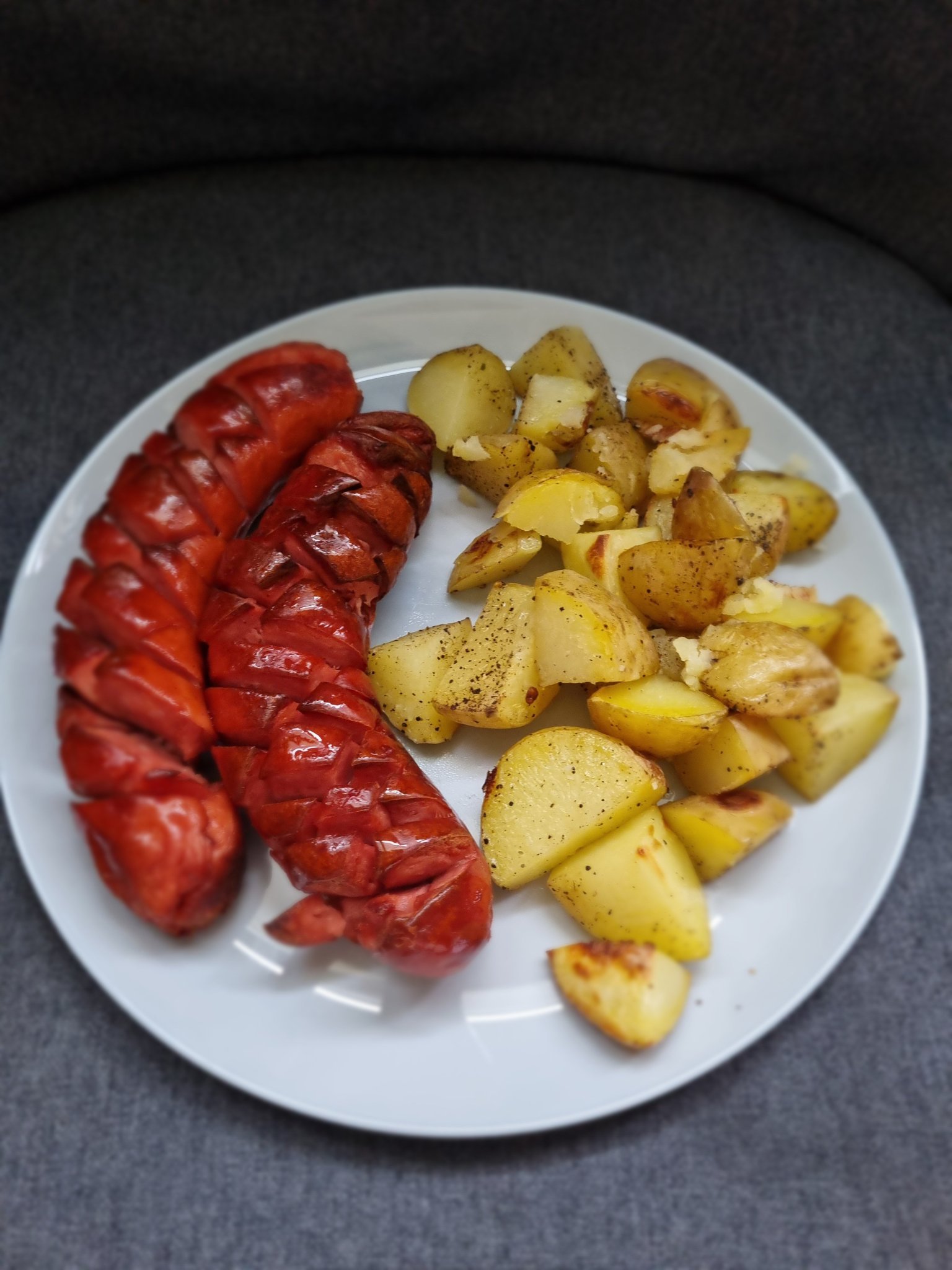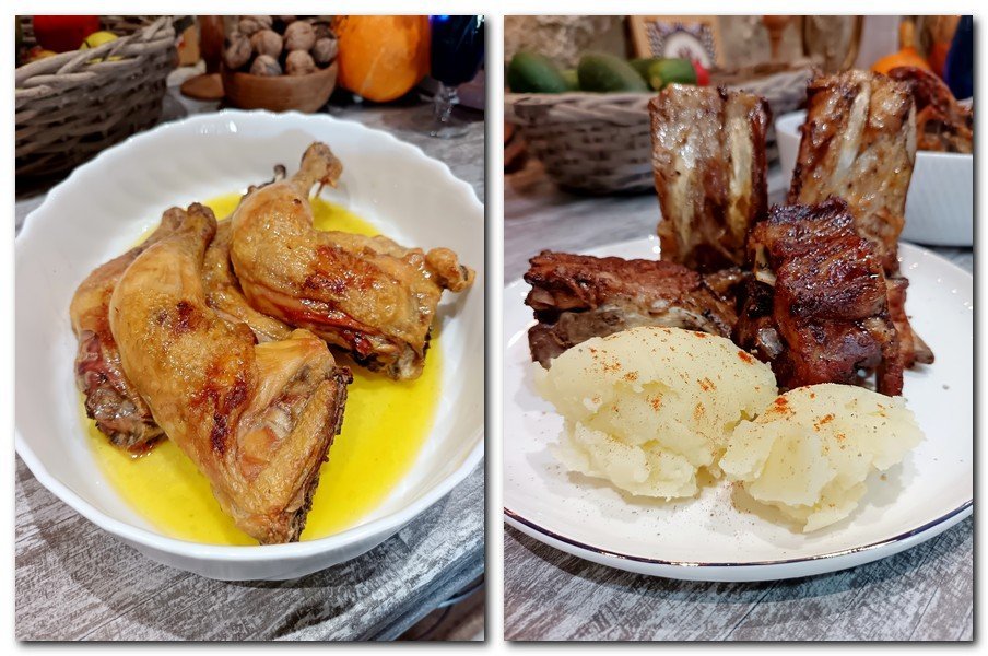 Пилешки бутчета само със сол, зехтин и малко масло. До тях рагу и картофено пюре.