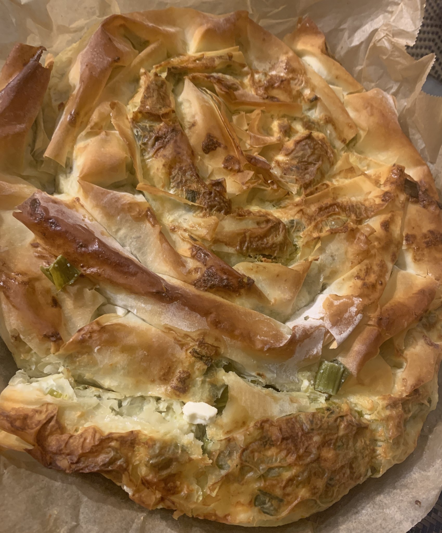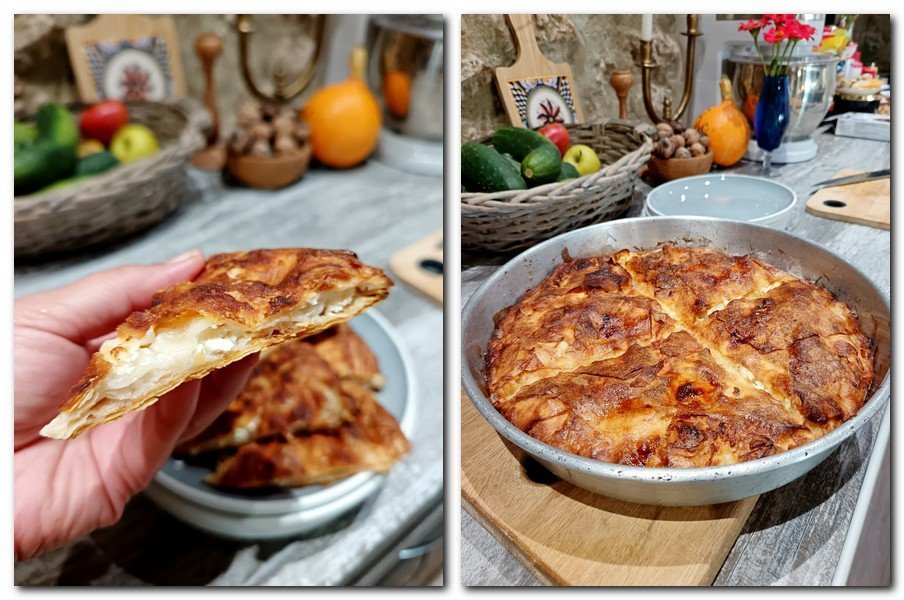Банички с дебелите турски кори от пакет правих. Накъсани, смотани, ама аз пак си ги купувам, че обичам баниците с тях.Понякога улучвам да не се разпадат и да са цели. Една тънка правих без яйца и една по-дебела с яйца.