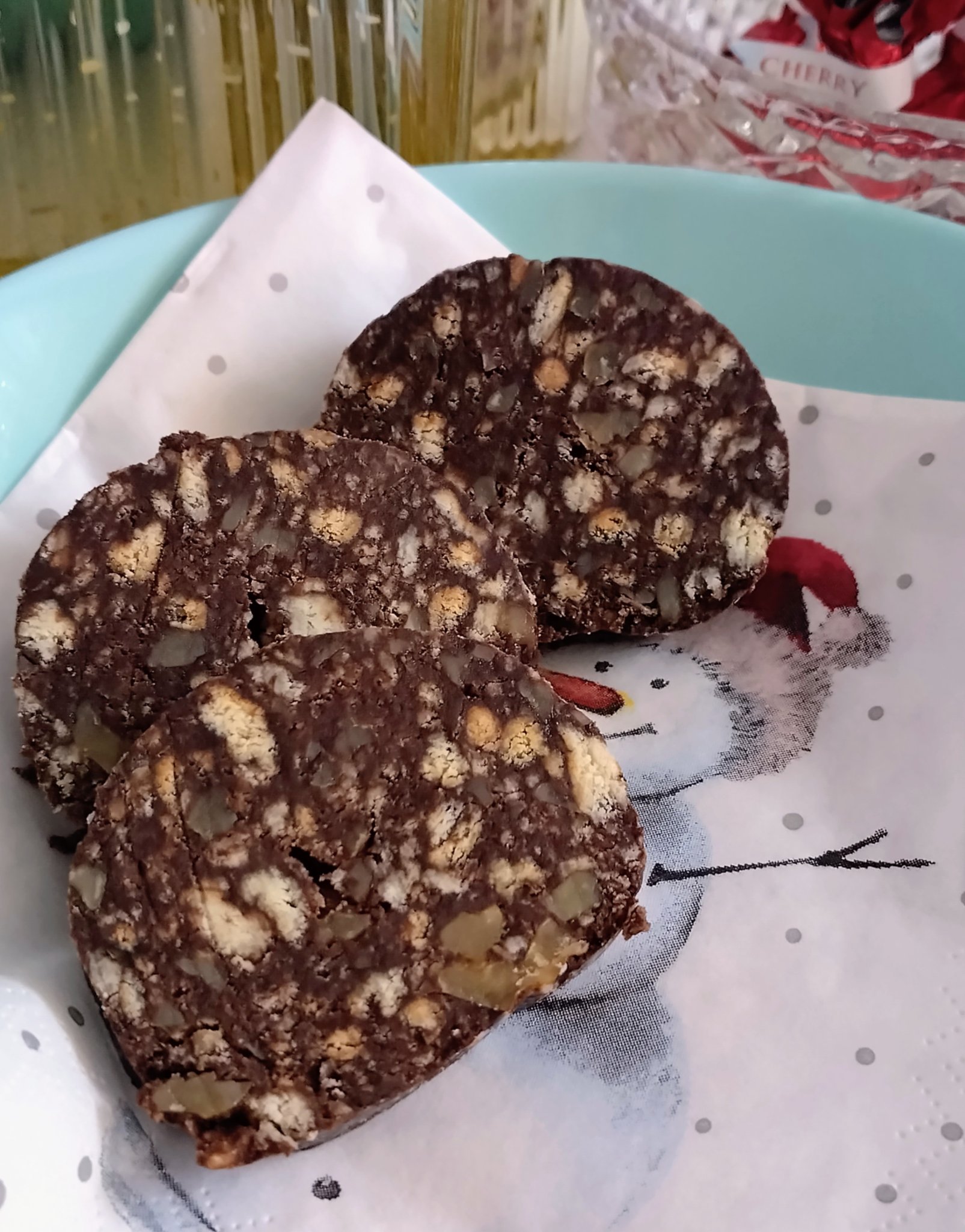 И сладък салам по рецепта на Бени, който за вчерашната новогодишна вечеря стана на ефектни и вкусни бонбони