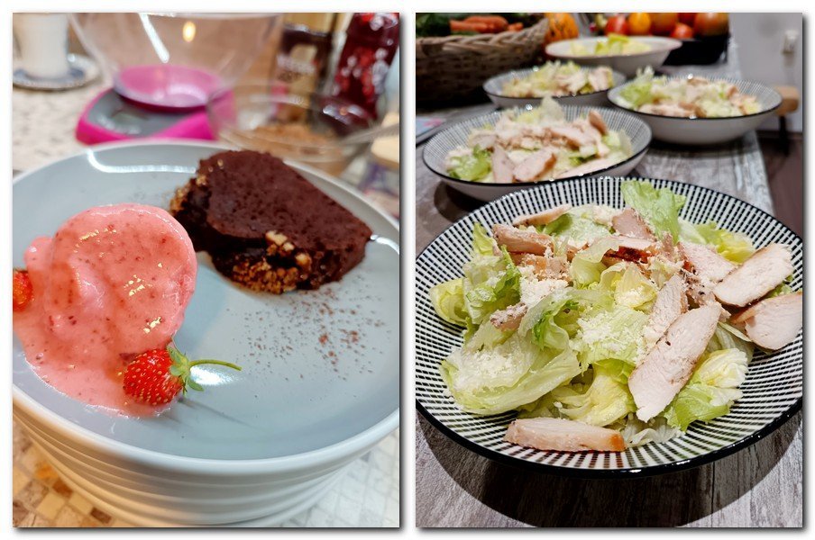Брауни кекса в компания на ягодов сладолед и Цезар, но без крутони