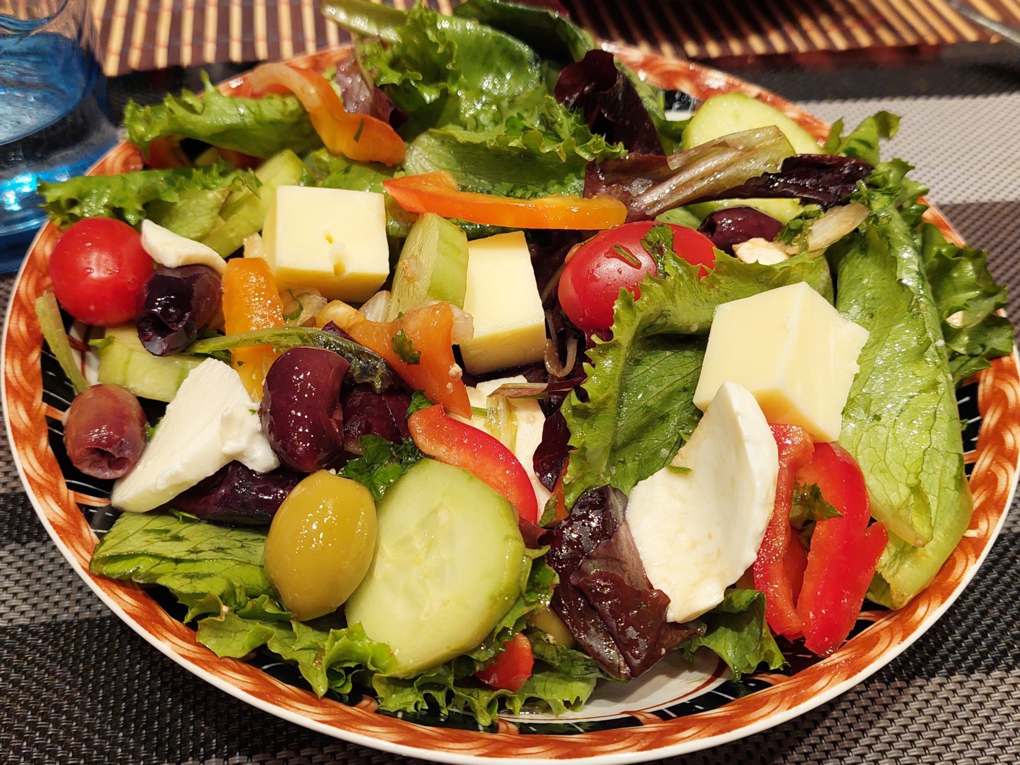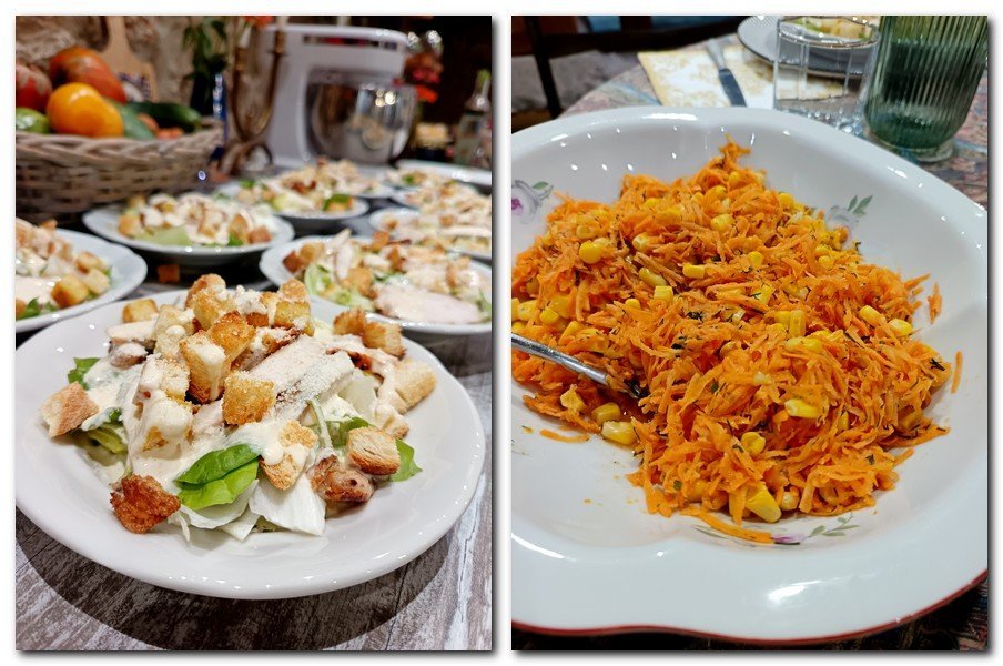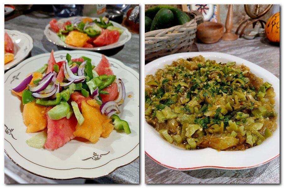 Една салата с последните градински зеленчуци и една с печени зелени домати на Илиана Моята с добавени печени зелени камби и пипер
