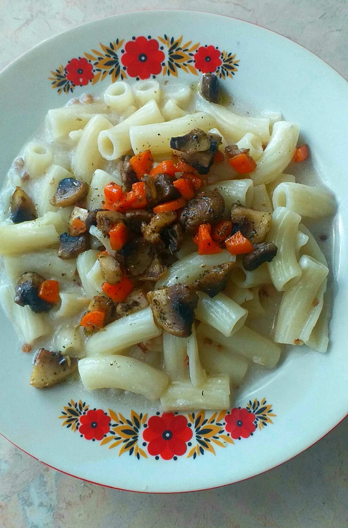 Някак съм забравила да снимам свински късчета с гъби, лук и сметана, но днешния обяд е документиран: